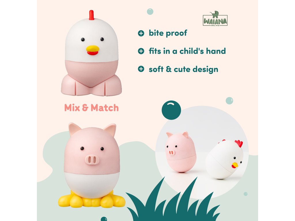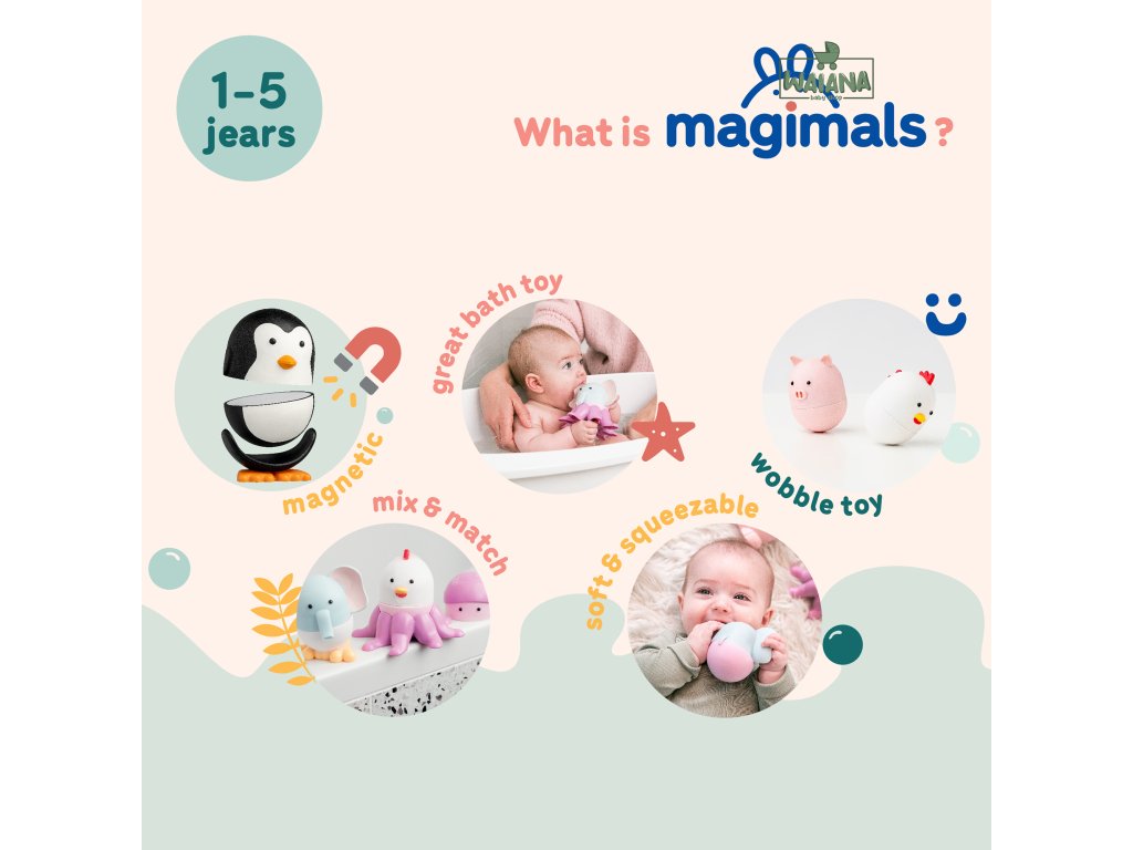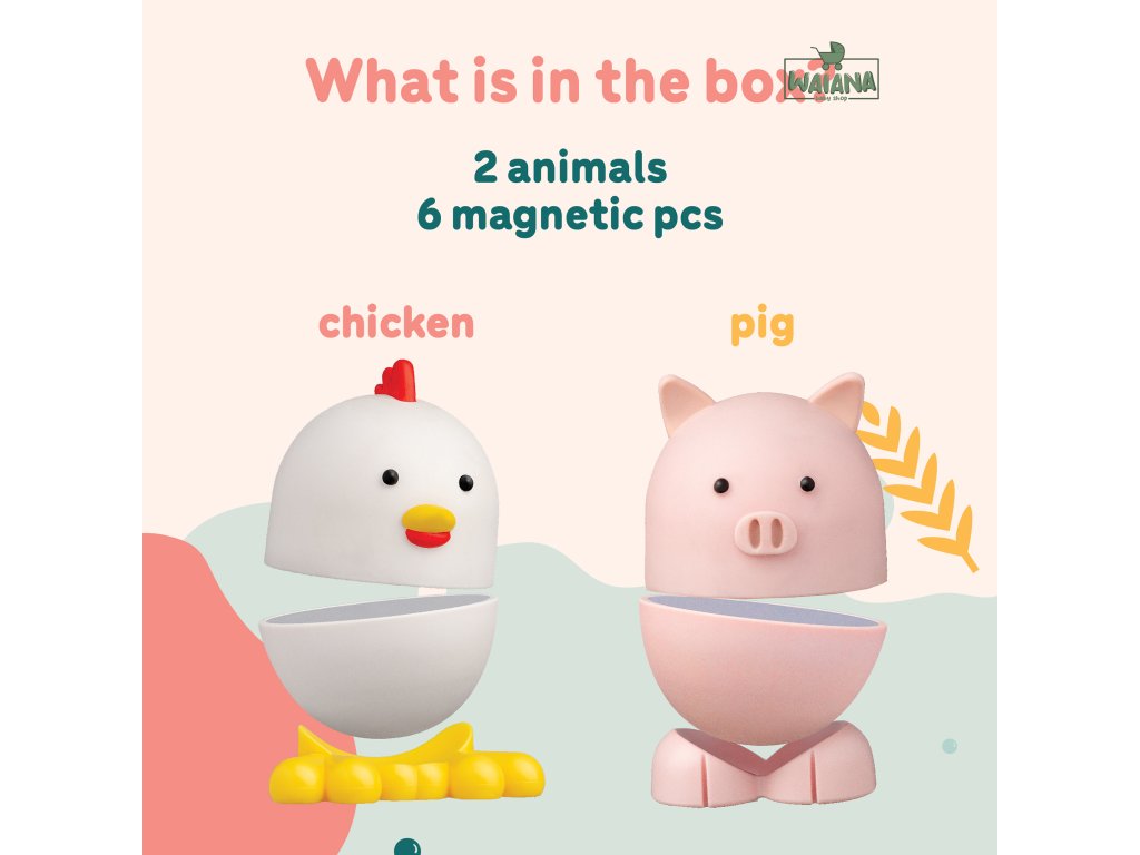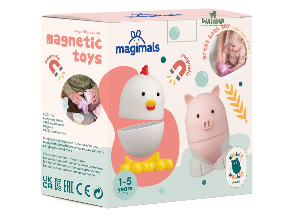 Skladacie magnetické zvieratká Farma Interaktívna hračka Magimals pre najmenších Skladacie magnetické zvieratká Farma Magimals zabavia už deti okolo 1 roku. Balenie obsahuje dve rozkošné zvieratká z farmy: sliepku a prasiatko. Každé je zložené z 3 častí: nožičiek, telíčka a hlavičky z mäkkého materiálu. Týchto 6 častí je možné medzi sebou navzájom kombinovať, čo predĺži detskú hru a sústredenie. Zvieratká sa dajú jednoducho skladať vďaka silným a bezpečným magnetom, je možné ich stláčať aj hrýzť. Zložené zvieratko deti využijú aj ako zábavnú hojdaciu hračku, ktorá sa nikdy neprevráti, alebo ako mäkkú hračku do vane.Roztomilá didaktická hračka do izbičky aj do vane Vďaka magnetickej skladačke Magimals Farma sa deti stanú malými prieskumníkmi. Figúrky totiž stimulujú predstavivosť a podporujú kognitívny rozvoj. Dokonale si vďaka nim precvičia hmat, úchop aj logické myslenie. Budú kreatívne kombinovať a objavovať svet zvierat. Magimals sú jedinečné kreatívne hračky pre bábätká, ktoré sú vyrobené z jemného, bezpečného, netoxického a umývateľného materiálu odolného voči detským zúbkom. Magnetická skladačka je vhodná ako darček k 1. narodeninám.
