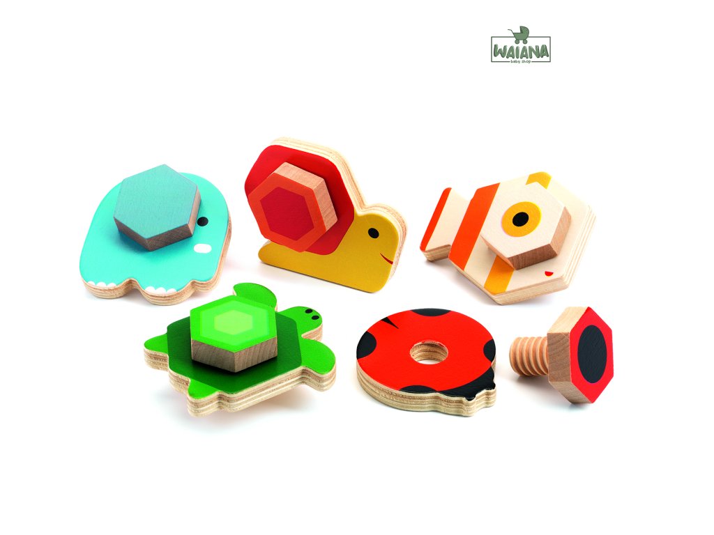 Skrutkovanie Zvieratá Ktorá skrutka kam patrí, zistíš aj podľa farby Hračka TournaBasic sa skladá z 5 drevených doštičiek v tvare zvieratka a z 5 drevených skrutiek, ktoré do doštičky zaskrutkuješ. Slonovi tak priskrutkuješ ucho, slimákovi ulitu, rybke oko, korytnačke pancier a lienke bodku. Výborné na precvičenie prstov, koordinácie oko-ruka a spolupráce oboch rúk Hračka patrí do produktovej série Basic, ktorá je určená pre prvé vzdelávacie úlohy. Vyznačuje sa minimalistickým dizajnom a jemnými farbami v kombinácii s prírodnou farbou dreva. Podporuje spoznávanie tvarov, farieb, utváranie matematických predstáv, rozvoj jemnej motoriky a logického myslenia.Obsah: 10 drevených dielikov (5x doštička v tvare zvieratka a 5x skrutka)Odporúčaný vek: 18m+Rozmery balenia: 20 x 15 x 5 cm
