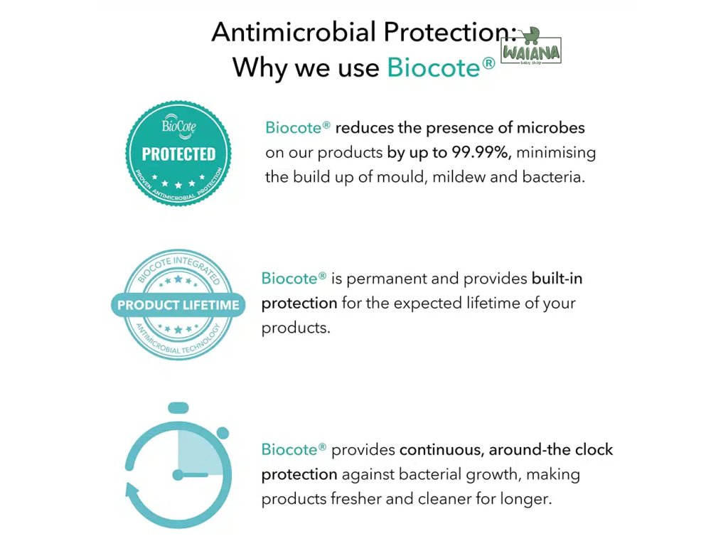 Všetky produkty obsahujú BioCote® antibakteriálnu ochranu, ktorá redukuje množstvo mikróbov na povrchu, takže zostávajú čistejšie a sviežejšie ako bežné hryzadlá.