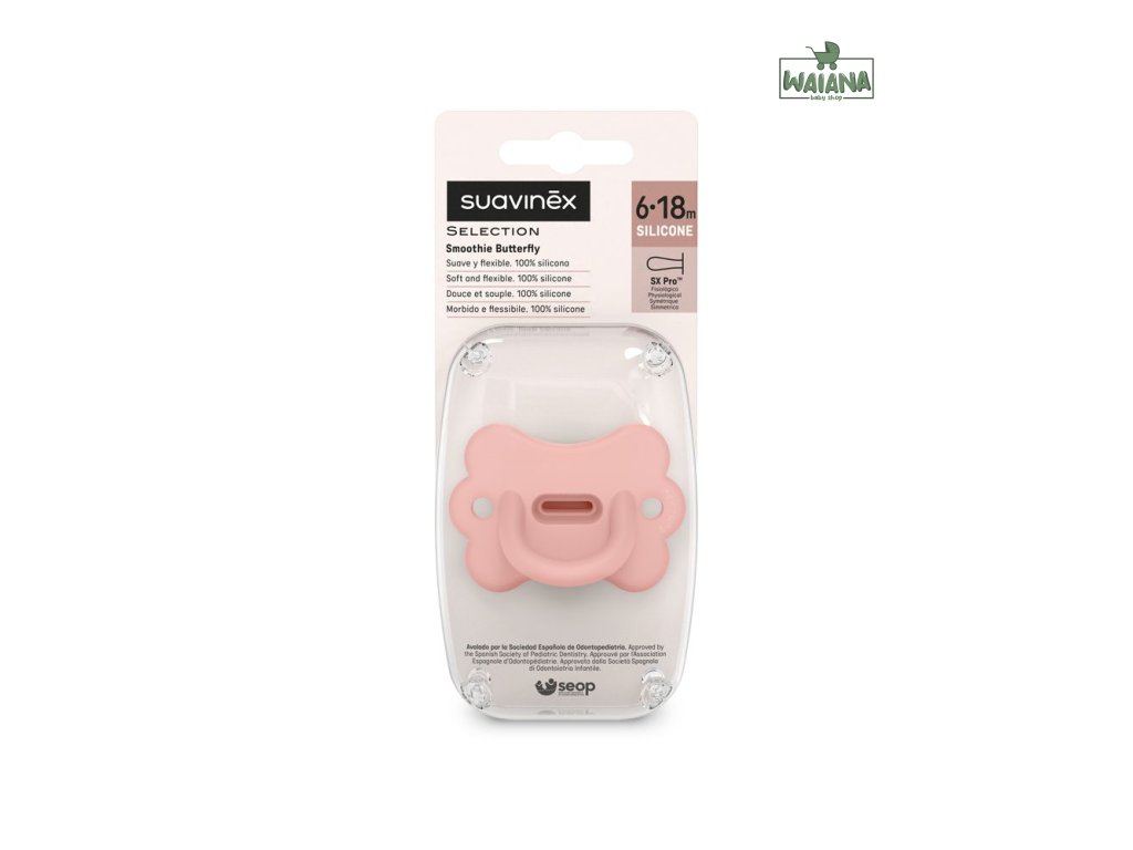 SUAVINEX | CUMLÍK fyziologický BUTTERFLY SILIKON 6-18m SX PRO - COLOUR ESSENCE - ružové