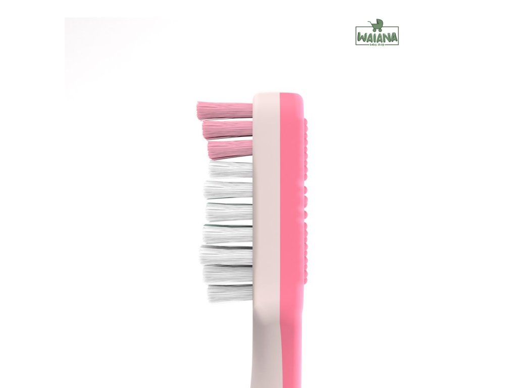 - Má mäkké štetinky usporiadané do tvaru ´Z´, ktoré lepšie dosiahnu do ťažko dostupných miest. Farebné označenie na štetinkách pomáha rodičom ľahko dávkovať správne množstvo zubnej pasty - veľkosti hrášku.