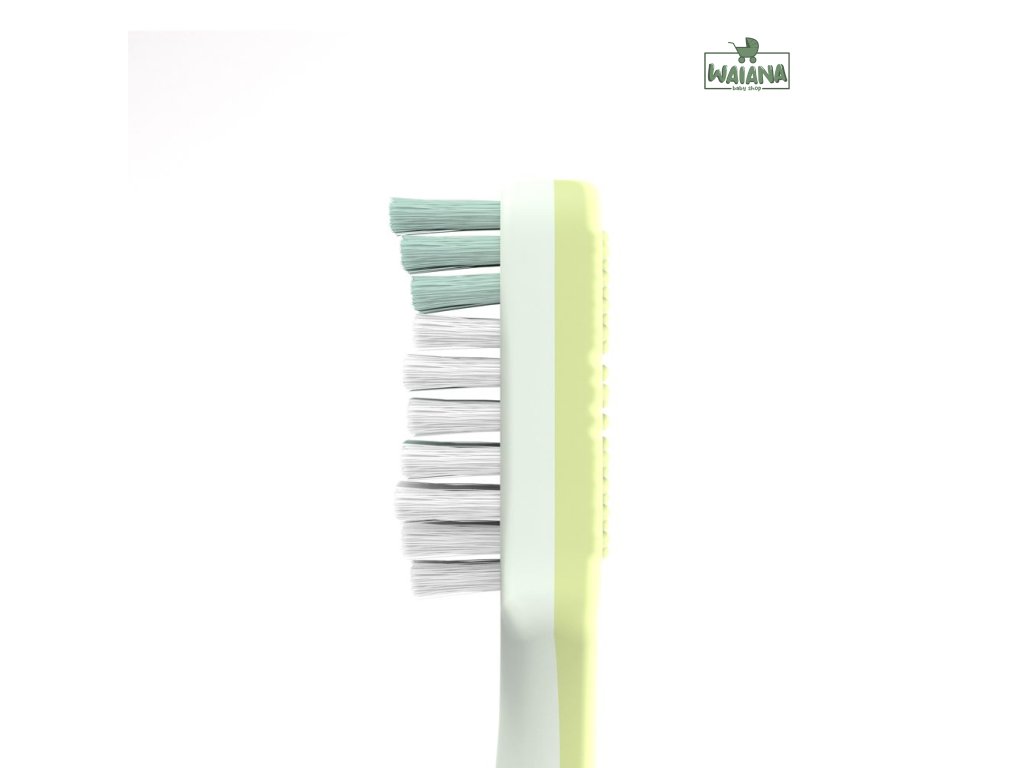 - Má mäkké štetinky usporiadané do tvaru ´Z´, ktoré lepšie dosiahnu do ťažko dostupných miest. Farebné označenie na štetinkách pomáha rodičom ľahko dávkovať správne množstvo zubnej pasty - veľkosti hrášku.