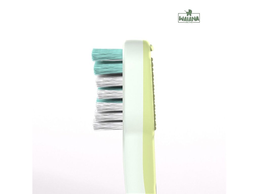 - Kefka má mäkké štetinky, ktoré sú šetrné k citlivým a podráždeným ďasienkam pri prerezávaní zúbkov. Farebné označenie na štetinkách pomáha rodičom ľahko dávkovať správne množstvo zubnej pasty.