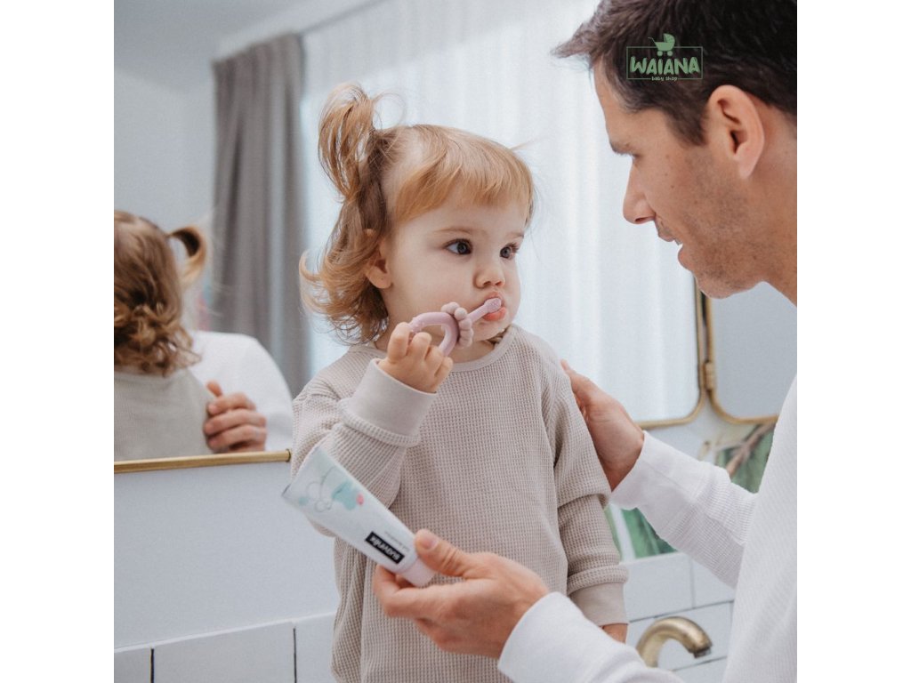 - kyselinu hyalurónovú, ktorá sa stará o citlivé detské ďasná a je kľúčovou zložkou pre regeneráciu, hydratáciu a upokojenie.