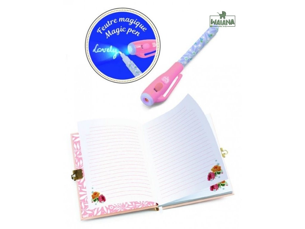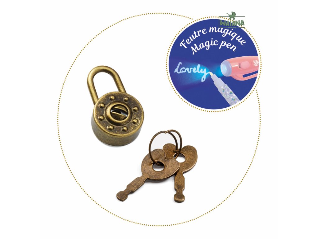 Tajný zápisník s magickým perom S touto sadou budú tvoje tajomstvá v bezpečí. 88 -stranový linajkový zápisník s plnofarebnou pevnou obálkou so zlatým metalickým leskom a visacím zámkom s dvoma kľúčikmi. Vyrobený z FSC papiera. Súčasťou je pero s neviditeľným atramentom a zdrojom UV svetla vo vrchnáku. Balený v priehľadnom obale. Každú stranu dopĺňa malá ilustrácia. Skvelé aj na písanie tajných správ. Na písanie tajných zápiskov je určené pero s neviditeľným atramentom. Zápisky sa ukážu až pod UV svetlom. Zdroj UV svetla, tlačidlo na zapnutie/vypnutie svetla a 3 batérie typu LR44 sú priamo vo vrchnáku pera. Batérie sú súčasťou balenia. Vrchnák má praktický klips na pripnutie pera. Pero má fixkový hrot. Zápisník je vyrobený z kvalitného papiera s gramážou 120 gsm (t. j. vyššou než štandardný kancelársky papier) a s ekologickým certifikátom FSC. Rozmery zápisníka: 15,5 x 20 x 1,2 cm. Rozmery pera: 0,5 x 13 cm.