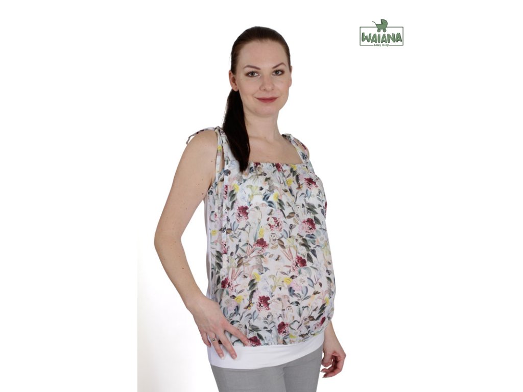 Vzdušná tehotenská elegantná blúzka na ramienka. Predný diel je z príjemného splývavého materiálu s potlačou. Vo vrchnej časti je tunelík, ktorým je pretiahnutá šnúrka na stiahnutie, ktorá slúži ako ramienko na zaväzovanie na ramene. Zadný diel je rovnako ako dolný lem trička z jednofarebnej viskózy.