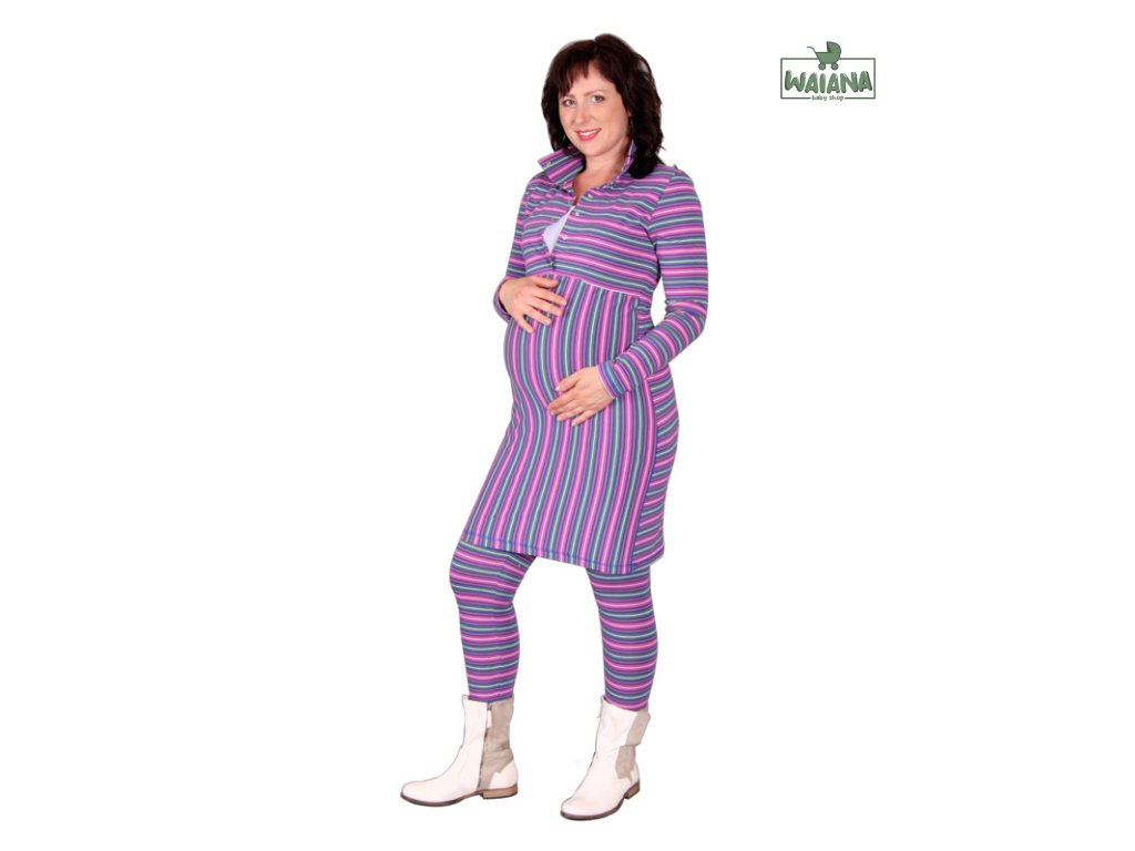 Veľmi pohodlné dojčiace šaty s dlhými rukávmi. Zatiahnuté pod prsiami, predná časť je so stojačikom a zapína sa na cvočky, vsadka je z kontrastne farebného materiálu. Zadný diel je členný stredovým švom. Sú ušité z originálneho bavlneného prúžku s prímesou lycry.