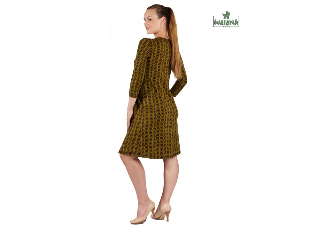 Šaty sú voľnejšieho áčkového strihu. Predná časť je rozdelená na vrchnú (prsia) a dolnú (sukňová) časť. Vrchná časť je radená na prsiach a je pod ňou vložená vsadka s prestrihmi pre pohodlné kojenie. Výstrih zapravený širším lemom ukončený viazačkami. Sukňová časť riasená stredom na bruško. Rukávy 3/4 s riasením na ramenách ukončené úzku manžetou. Dĺžka šiat ku kolenám.