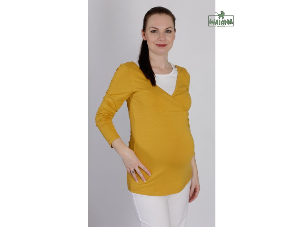 Veľmi pohodlné tehotenské a dojčiace tričko stiahnuté pod prsiami, predná časť s preloženým výstrihom do V, kontrastná vsadka má malý okrúhly výstrih a nadväzuje na malú vsadku zadného dielu. Má áčkový strih s miernym predĺžením predného dielu a dlhé rukávy.