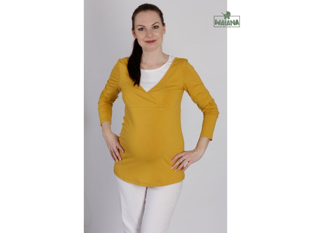 Veľmi pohodlné tehotenské a dojčiace tričko stiahnuté pod prsiami, predná časť s preloženým výstrihom do V, kontrastná vsadka má malý okrúhly výstrih a nadväzuje na malú vsadku zadného dielu. Má áčkový strih s miernym predĺžením predného dielu a dlhé rukávy.
