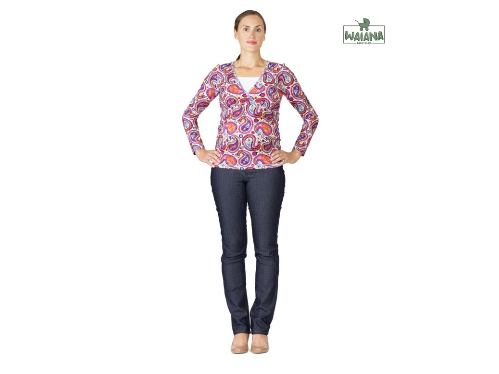 Veselé dojčiace a tehotenské tričko s dlhým rukávom. Je vyrobené z prírodného, priedušného a pritom pružného materiálu. Prekrížený výstrih je doplnený vnútorným dielom pre ľahké dojčenie. Vďaka svojej farebnosti a vzoru tlače sa tričko hodí prakticky k všetkým nohaviciam a sukniam, využijete ho ako do práce tak aj na voľný čas.