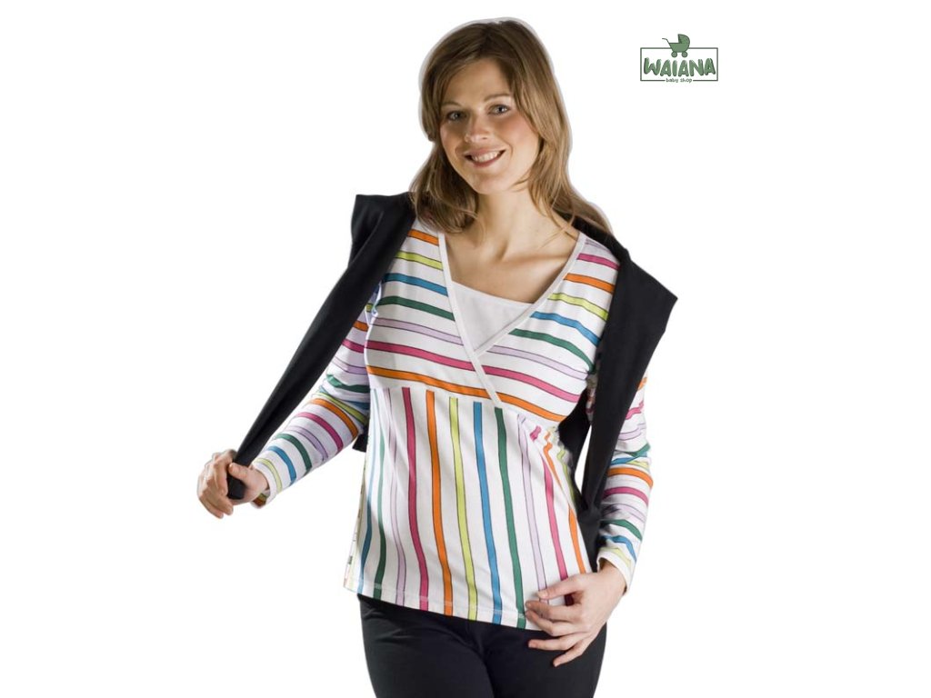 Veselé dojčiace a tehotenské tričko s dlhým rukávom. Je vyrobené z prírodného, priedušného a pritom pružného materiálu zo Španielska. Prekrížený výstrih je doplnený vnútorným dielom pre ľahké dojčenie. Spodná časť predného dielu je nariasená do vodorovného švu a toto riasenie spolu s elasticitou úpletu vytvára dostatok priestoru pre bruško. Vďaka svojej farebnosti a vzoru tlače sa tričko hodí prakticky k všetkým nohaviciam a sukniam, využijete ho ako do práce tak aj na voľný čas.