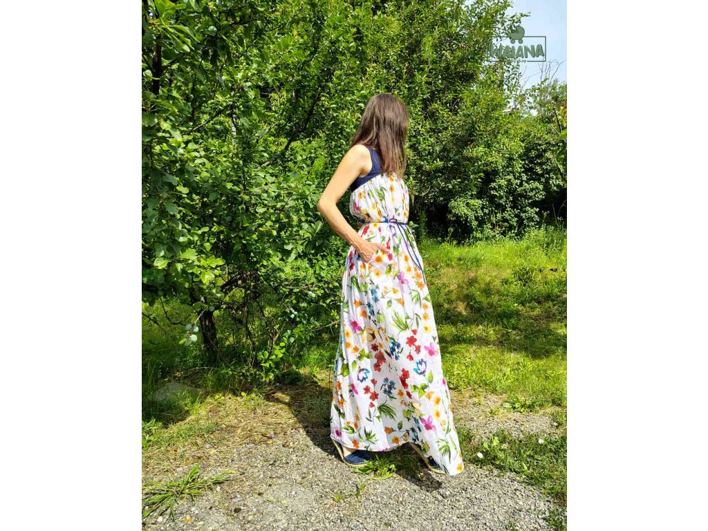 Originálne trendové dlhé šaty s vreckami a farebnými kvetmi. Šaty majú krátke sedlo z príjemnej viskózy, do ktorého je spodný diel šiat husto nariasený. V bočných švoch sú vrecká. Šaty sú podšité veľmi jemnou príjemnou bavlnou.