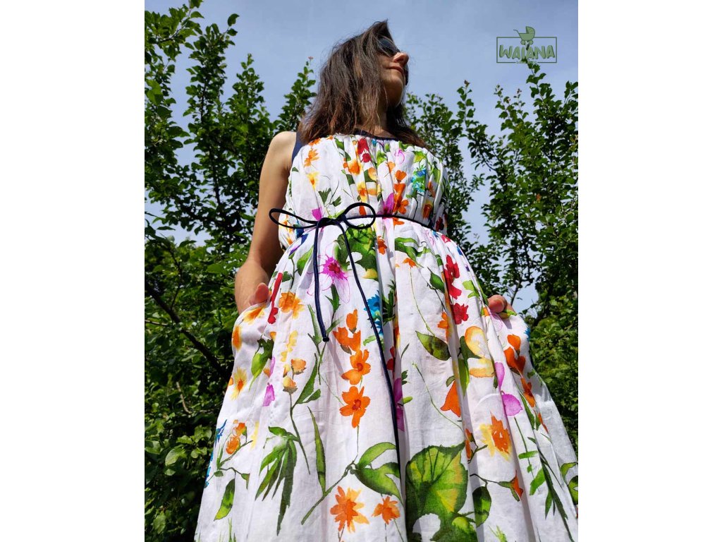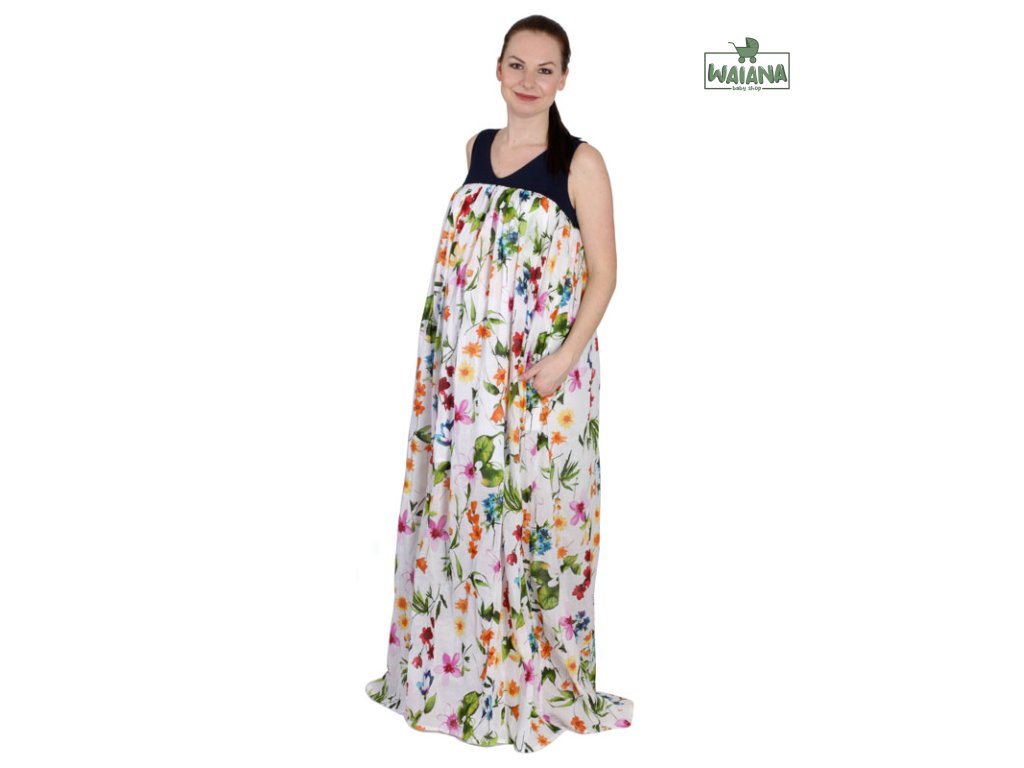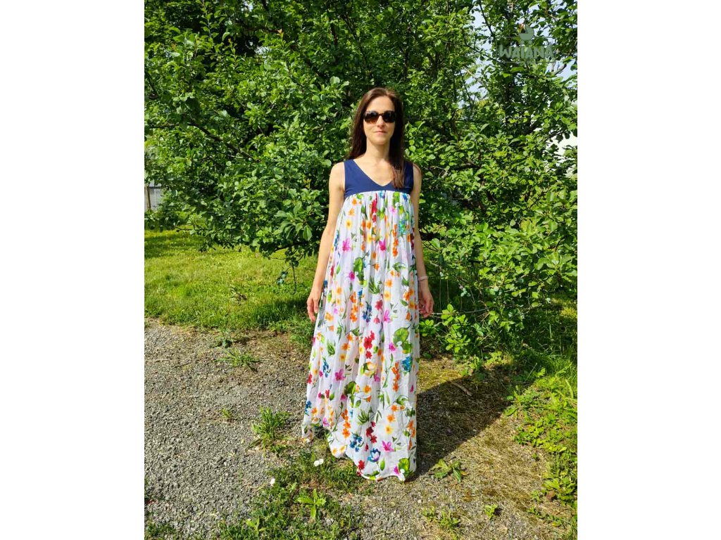 Originálne trendové dlhé šaty s vreckami a farebnými kvetmi. Šaty majú krátke sedlo z príjemnej viskózy, do ktorého je spodný diel šiat husto nariasený. V bočných švoch sú vrecká. Šaty sú podšité veľmi jemnou príjemnou bavlnou.