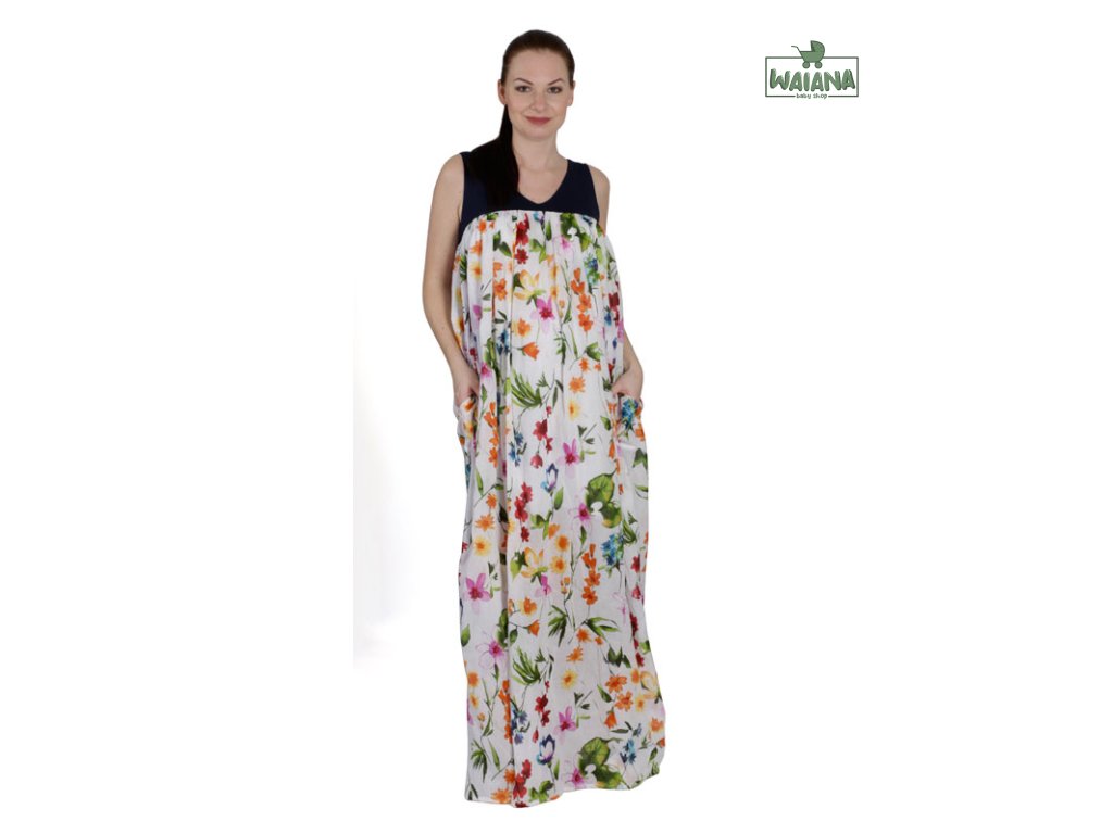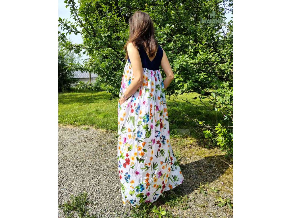 Originálne trendové dlhé šaty s vreckami a farebnými kvetmi. Šaty majú krátke sedlo z príjemnej viskózy, do ktorého je spodný diel šiat husto nariasený. V bočných švoch sú vrecká. Šaty sú podšité veľmi jemnou príjemnou bavlnou.