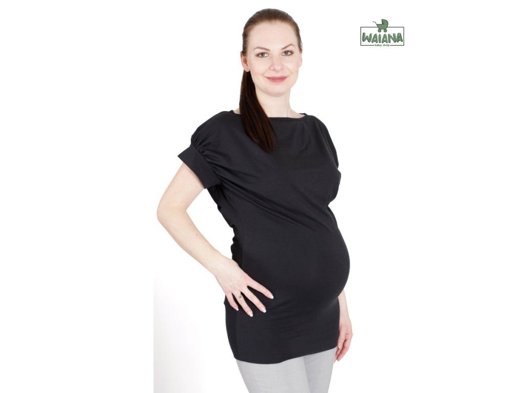 Vzdušné, ležérne tehotenské tričko s lodičkovým výstrihom. Tričko má krátky netopierí rukávik, ktorý je bohato nariasený do manžety v ktorej vrchnej časti je krátky ozdobný rozparok. Zadný diel je so stredovým švom. Spodná časť trička zakončená širokým lemom.