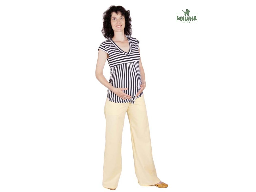 Veľmi príjemné tehotenské tričko s výstrihom do V a širokým lemom. Predný diel je členený sedlom pod prsiami, kde je riasenie pre vytvorenie voľnosti pre bruško. Spodná časť predného dielu je orientovaná vertikálne a opticky zužuje. Použitý materiál je elastický, čo zaisťuje prispôsobenie postave. Zadný diel je hladký, prúžky sú orientované kolmo na predný diel.