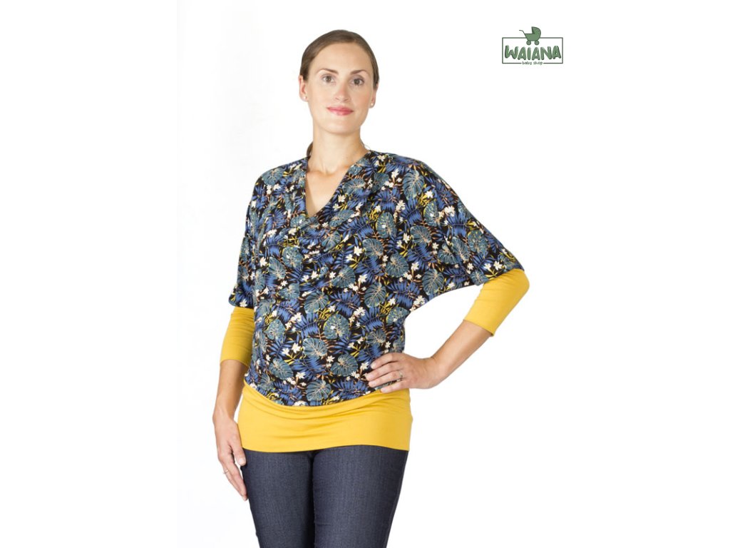 Multifunkčné tričko s netopierími rukávmi s širokými kontrastnými manžetami. Manžety sú široké 15 cm. Tričko má výstrih v štýle "voda". Zadný diel je členený stredovým švom. Skvele ho využijete aj po období tehotenstva.