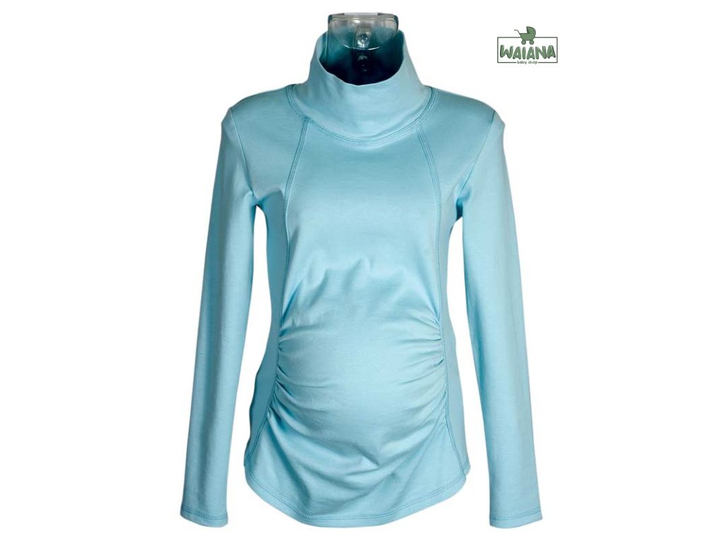 Bavlnené tehotenské tričko s dlhým rukávom a stojačikom. Predný diel je členený pozdĺžnymi švami, do ktorých je predný diel nabraný pre voľnosť na rastúce bruško. Členenie je ozdobne prešité. Tričko je teplejšie vďaka tomu, že je bavlnené.