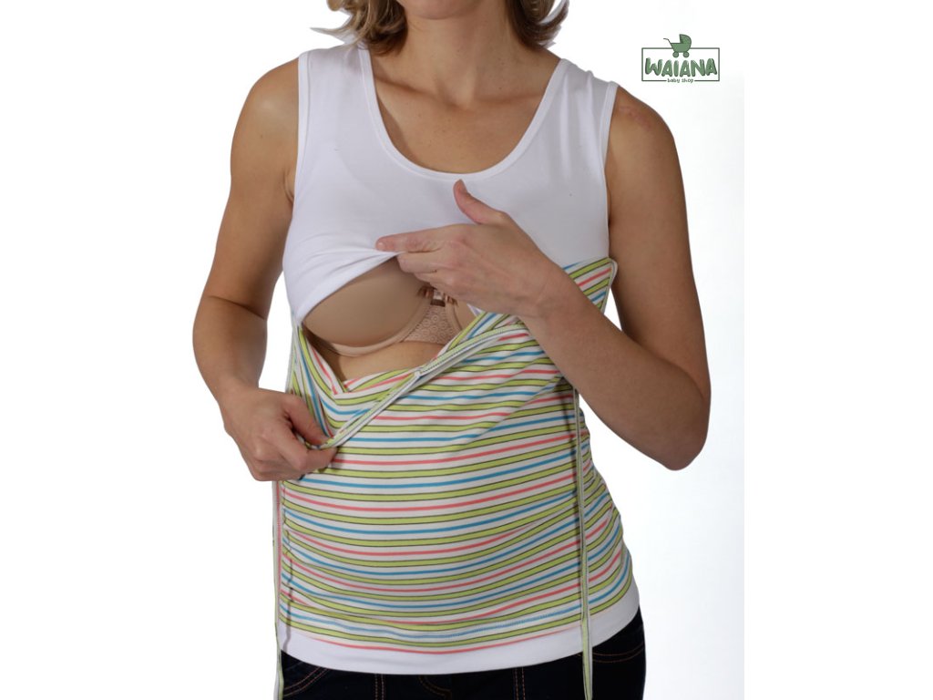 Tehotenský a dojčiaci top. Mierne riasené v bočných švoch, kde vznikne priestor pre rastúce bruško. Vrchný predný diel je dvojitý (vrchný PD sa zaväzuje za krkom), čo umožňuje dojčenie.