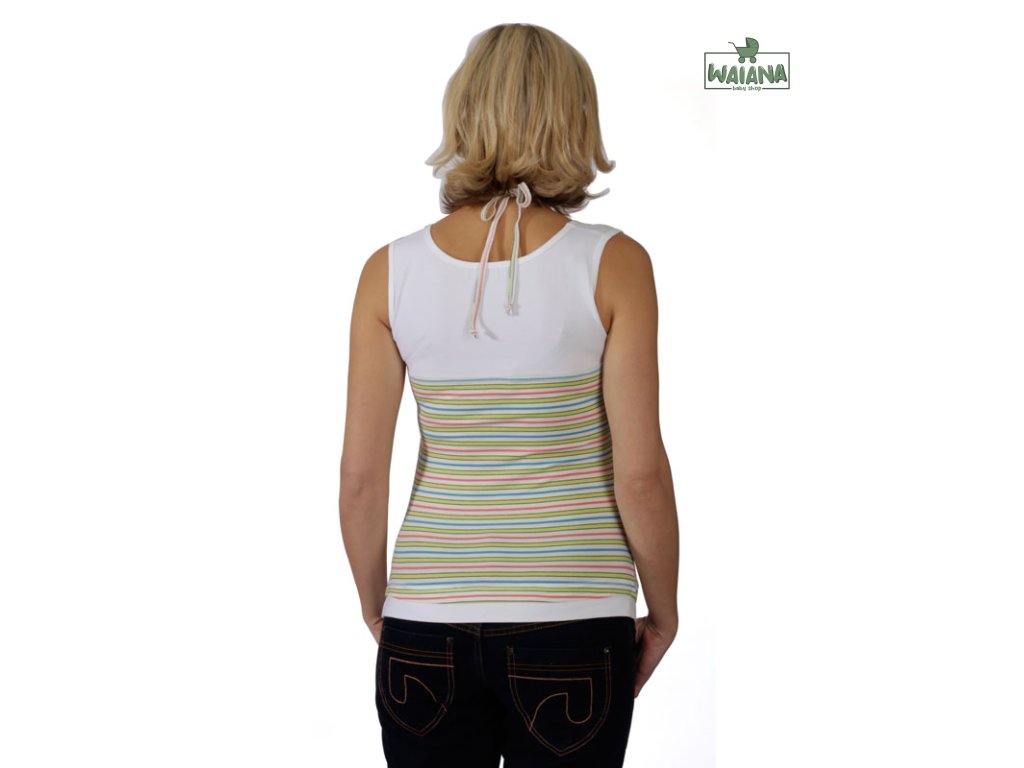 Tehotenský a dojčiaci top. Mierne riasené v bočných švoch, kde vznikne priestor pre rastúce bruško. Vrchný predný diel je dvojitý (vrchný PD sa zaväzuje za krkom), čo umožňuje dojčenie.