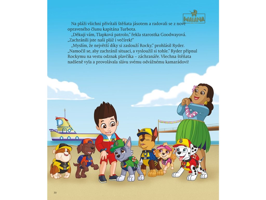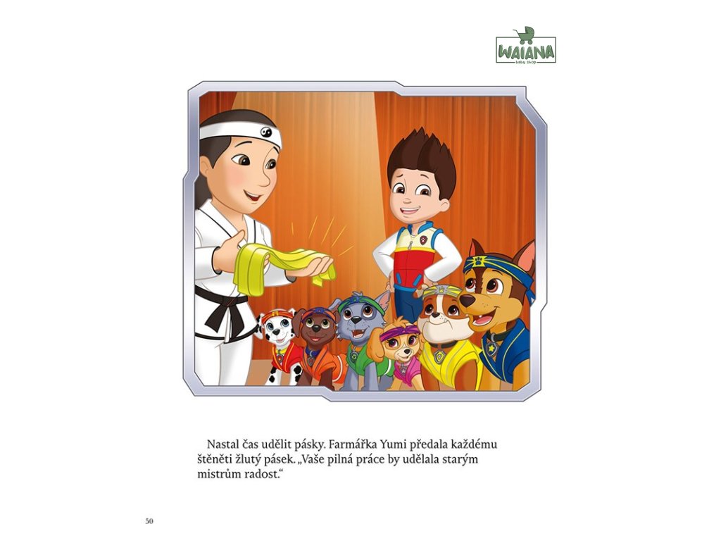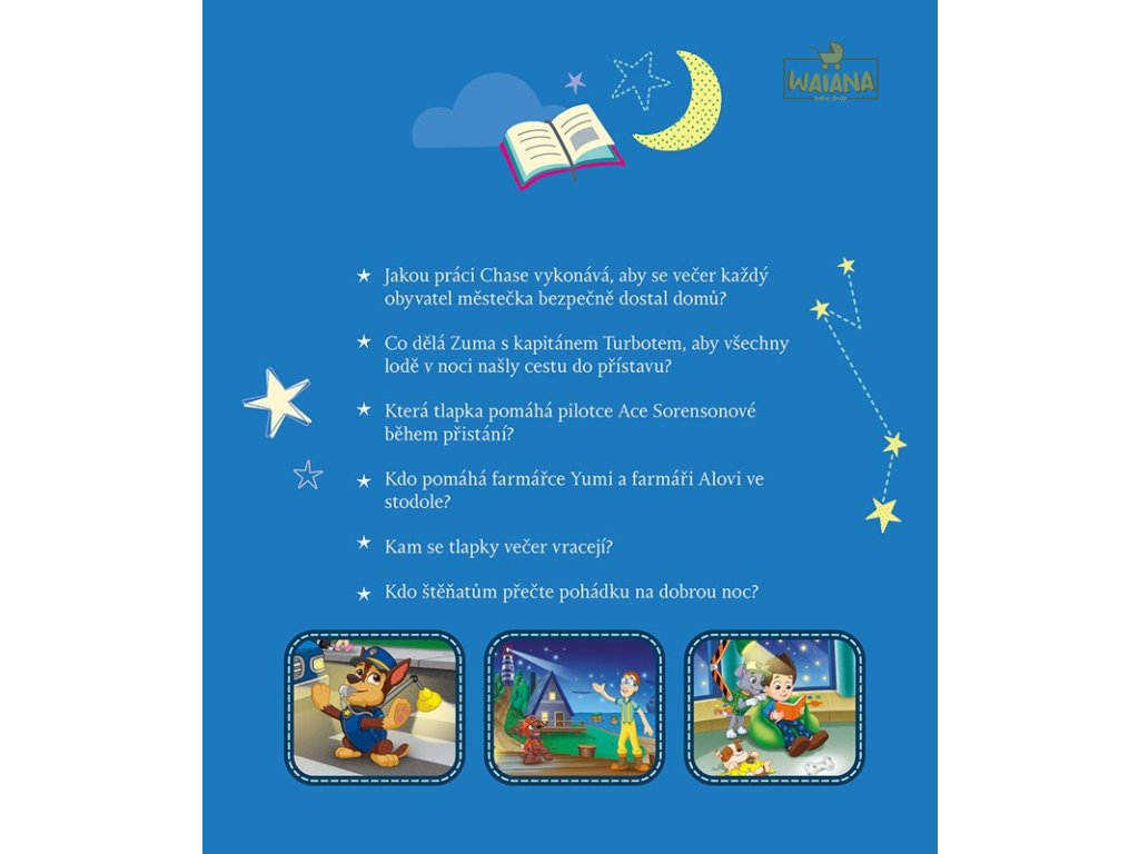 Chcete před spaním zažít parádní dobrodružství s Tlapkovou patrolou? Tak honem do postýlky s pohádkou! Tým odvážných hrdinů bude tentokrát zachraňovat chobotničku v nesnázích, zúčastní se napínavého závodu v Adventure Bay, vyzkouší si bojová umění, a když si Chase zlomí zoubek, navštíví i zubařskou ordinaci. Štěňata vyrážejí do akce, aby podala pomocnou tlapku kamarádům v nouzi. Na konci každého ze sedmi příběhů vás navíc čeká báječné překvapení: můžete si užít spoustu zábavy s otázkami k přečtené pohádce.