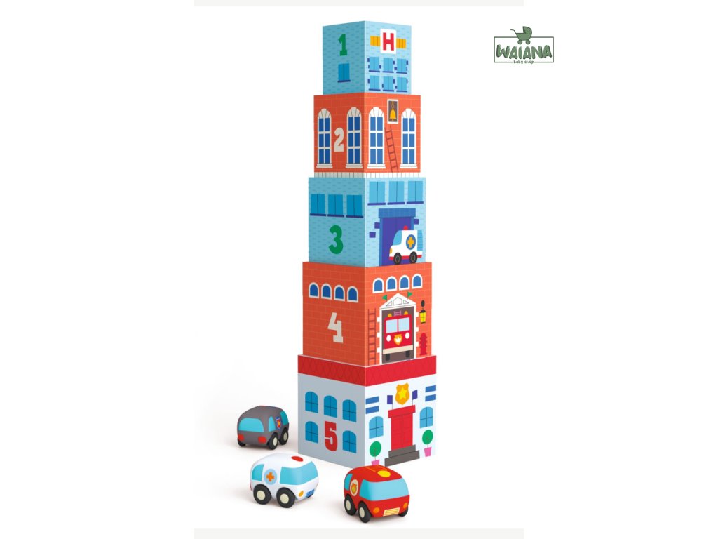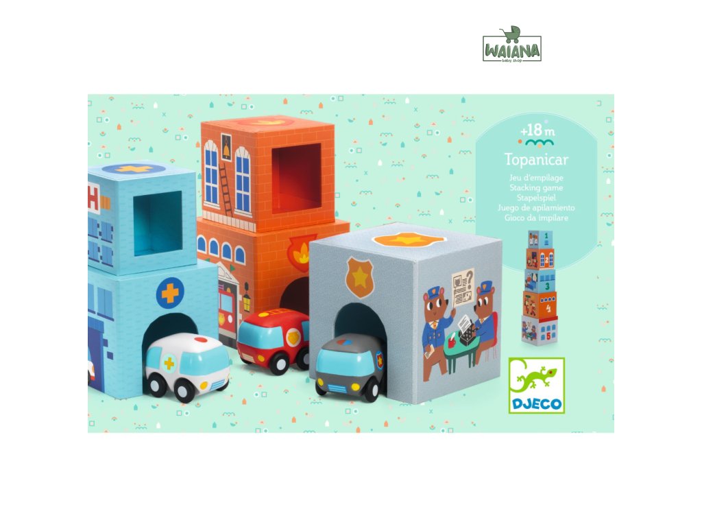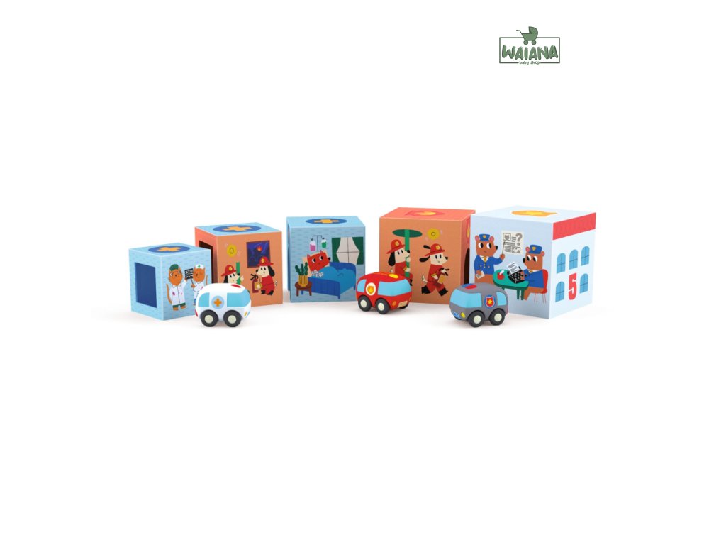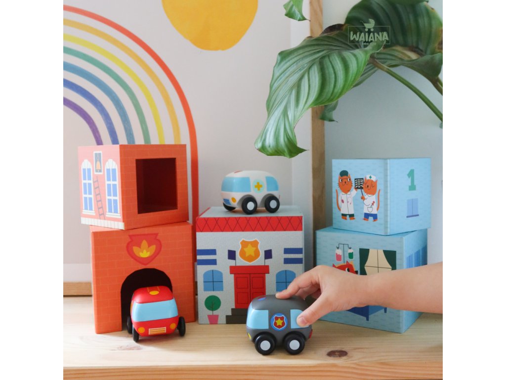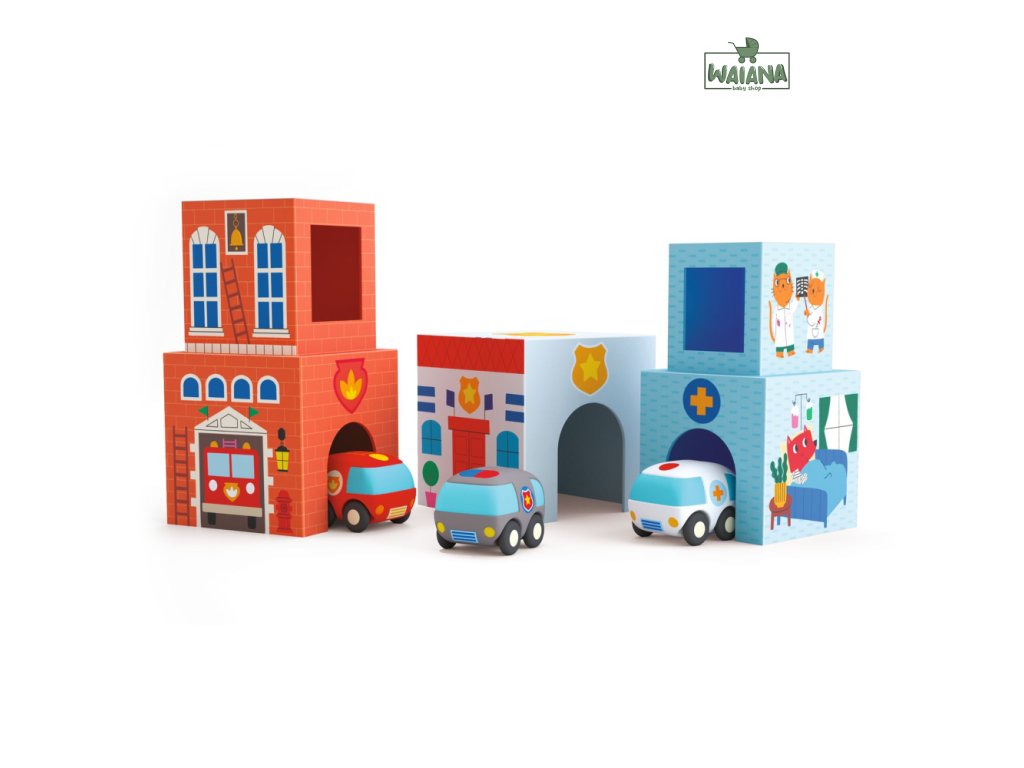 TopaniCar Domčeky z kociek pre autíčka Kocky a autíčka s umeleckými ilustráciami pre malých objaviteľov Táto kreatívna sada obsahuje 5 kociek z pevnej lepenky a 3 mäkké autíčka pre batoľatá – ambulanciu, policajné a hasičské auto. Kocky slúžia ako garáže pre autíčka a zároveň vďaka umeleckým ilustráciám predstavujú rôzne budovy a miesta, kde sa odohrávajú dôležité udalosti. Vďaka ekologickému certifikátu FSC® je hračka šetrná k životnému prostrediu. Sada podporuje rozvoj motorických zručností a fantázie u detí.Odporúčaný vek: 18+ mesiacov.Deti môžu:• stavať kocky do veže, čím vytvoria poschodový dom• používať kocky ako garíže pre autíčka• vkladať kocku jednu do druhejObsah balenia: • 5 kociek z lepenky• 3 autíčka z mäkkého plastu