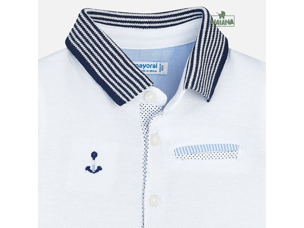 Krásné bílé POLO tričko s krátkým rukávem ideální pro jarní sezónu pro malého chlapečka od kvalitní španělské značky MAYORAL. Elegantní POLO triko v námořnickém designu s kapsičkou, pruhovaným límečkem a lemy rukávků. Na zadní části obrázek kotvy.