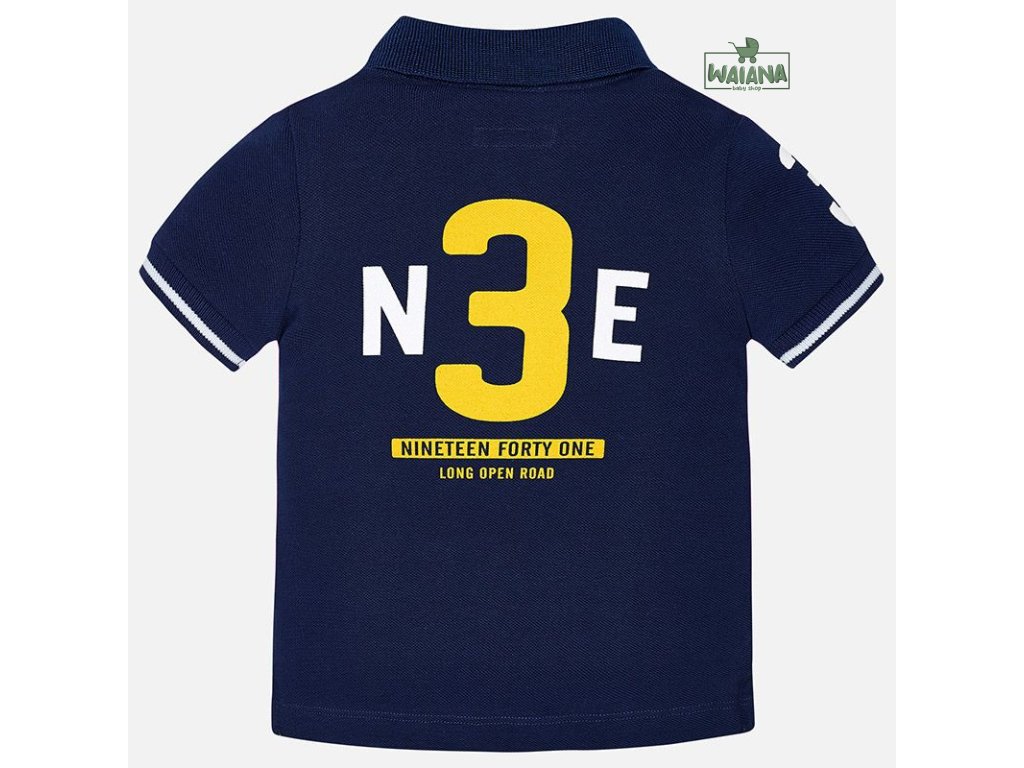 Krásné POLO tričko s krátkým rukávem ideální pro jarní sezónu pro malého chlapečka od kvalitní španělské značky MAYORAL. Elegantní POLO triko v námořnickém design. Na zadní části a rukávku číslo.