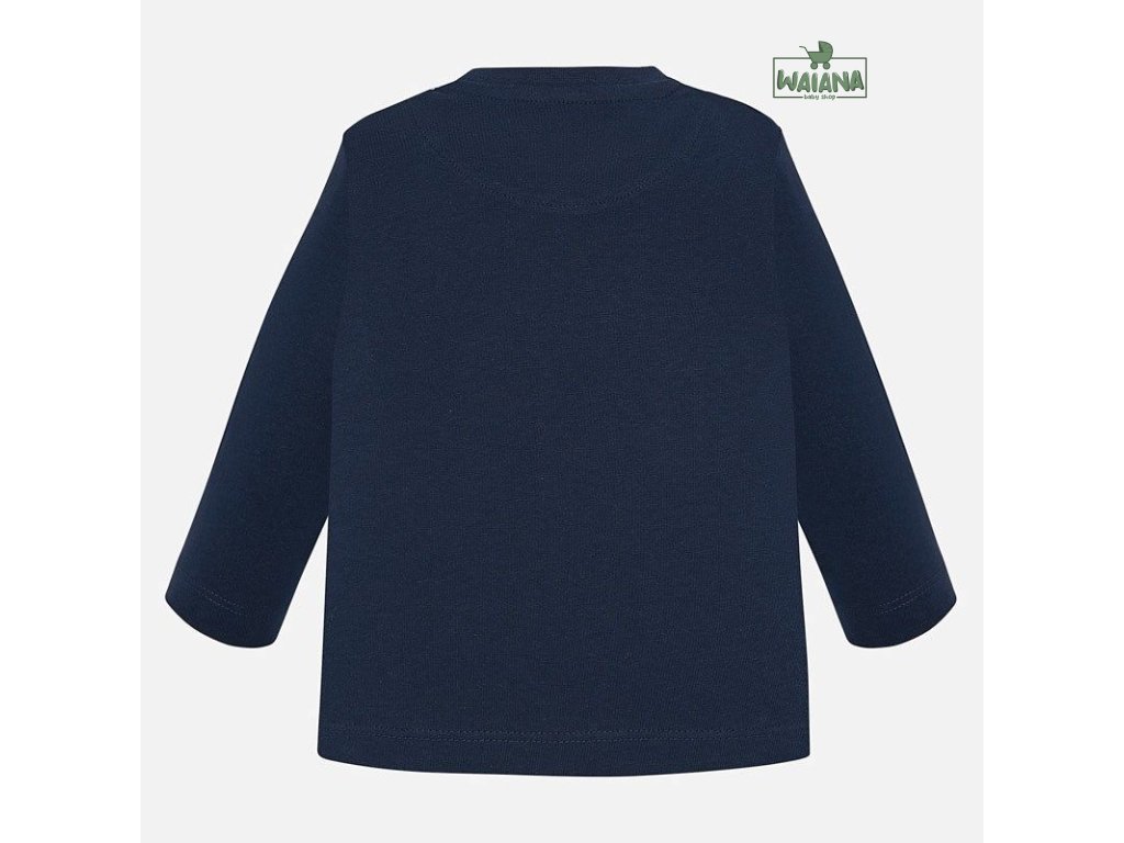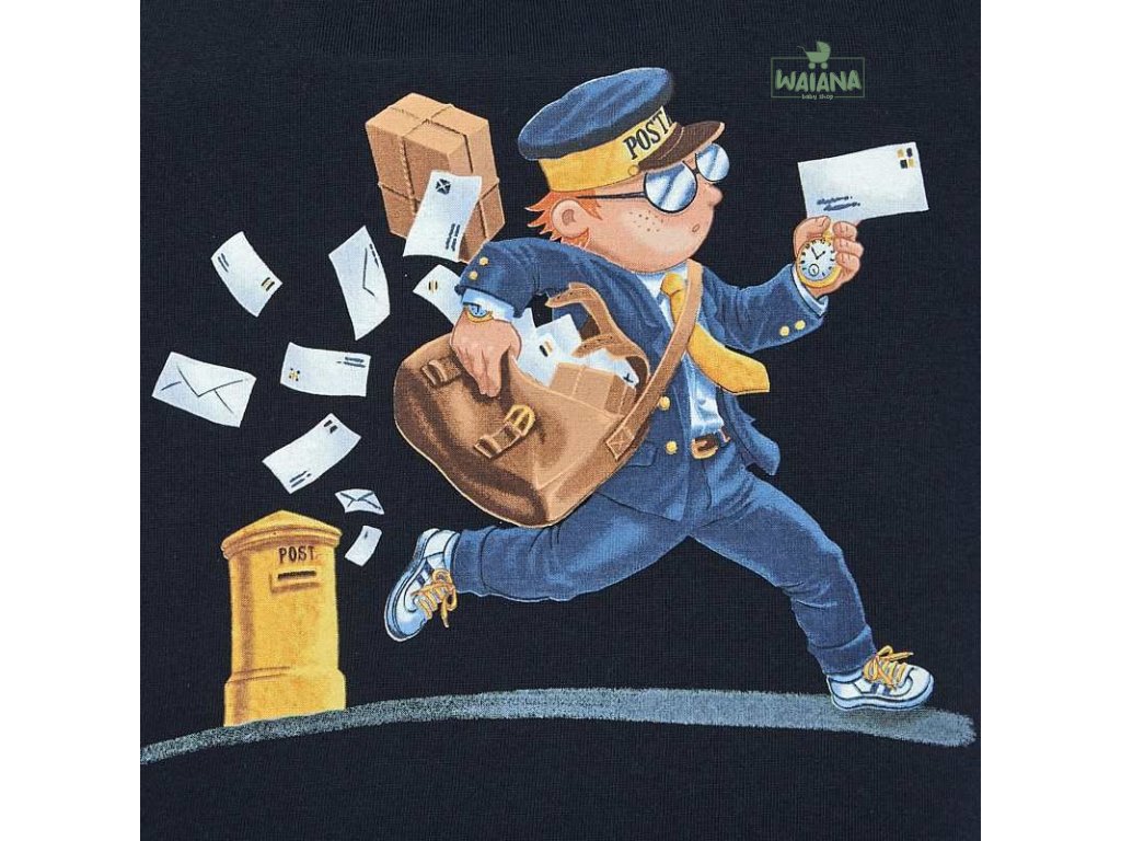 Krásné modré tričko s dlouhým rukávem ideální pro podzimní sezónu pro malého chlapečka od kvalitní španělské značky MAYORAL. Jednoduché triko s kulatým výstřihem a obrázkem pošťáka nesoucího noviny pro velkou radost malých rarášků.