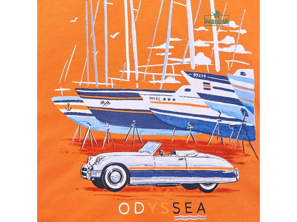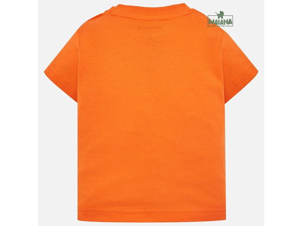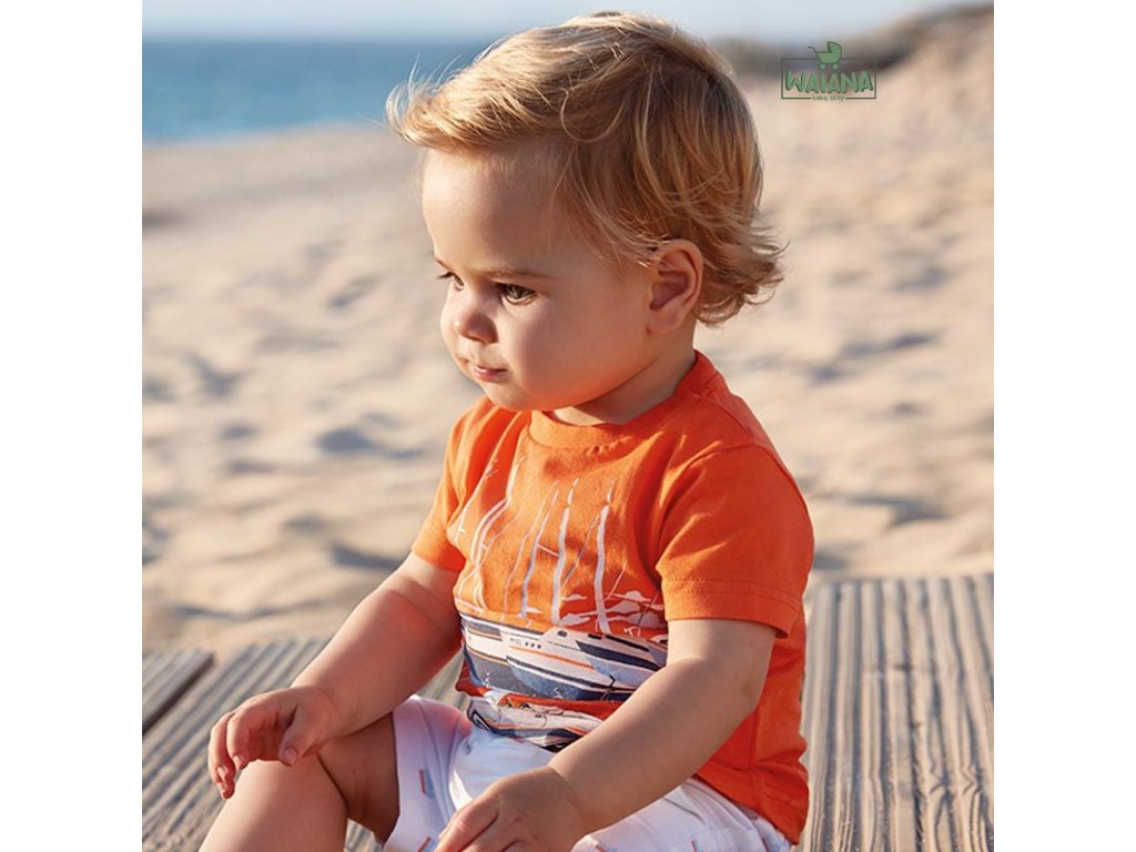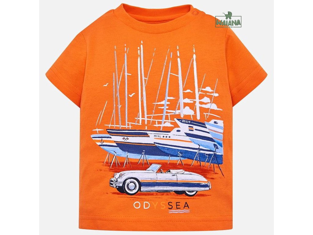 Krásné oranžové tričko s krátkým rukávem ideální pro letní sezónu pro malého chlapečka od kvalitní španělské značky MAYORAL. Jednoduché triko s kulatým výstřihem a obrázkem lodiček pro velkou radost malých rarášků.