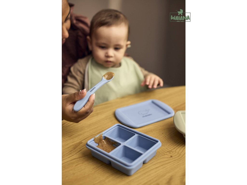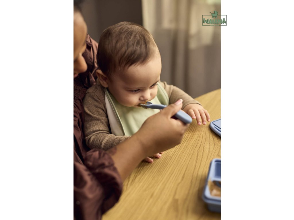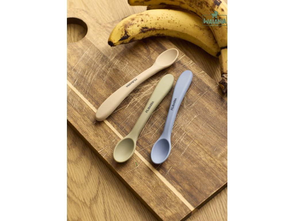 Navrhnuté s ohľadom na malé ústa, lyžičky majú mäkký silikónový povrch, ktorý chráni citlivé zúbky a upokojuje ďasná. Úzka hlavička lyžičky zaisťuje pohodlné naberanie, zatiaľ čo dlhá rukoväť je ideálna na kŕmenie a ľahké dosiahnutie na dno pohárov s detskou výživou. Vyrobené z potravinárskeho silikónu s certifikátom LFGB a vnútorným plastovým jadrom pre väčšiu stabilitu. Sú vhodné do umývačky riadu a navrhnuté na každodenné používanie.