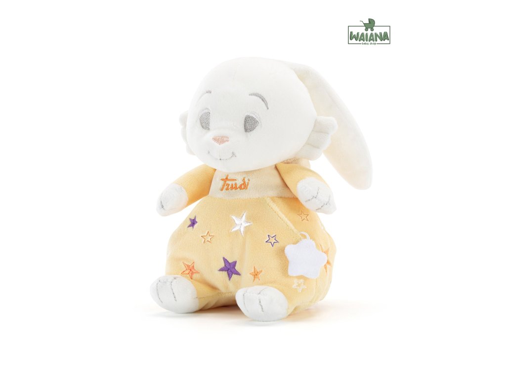 Jemný ako obláčik.Trudi baby star bunny sa vyznačuje jemnými doslova bábätkovskými farbami. Všetky detaily sú vyšívané a zvolené materiály sú mimoriadne jemné na dotyk. Pre najkrajšie sny bábätka.Trudi baby star, je rad venovaný maznáčikom na zaspávanie, ktoré sa vyznačujú množstvom jemnosti v kaskáde hviezd. Farby sú jemné a línie sladké, aby sprevádzali tých najmenších vo svete nežnosti. Údržba.Tovar je možné prať v práčke na 30°C, ak to veľkosť dovoľuje, prípadne je možné prať ručne pomocou hubky a neutrálneho mydla.Veľkosť: 12x19x13cm