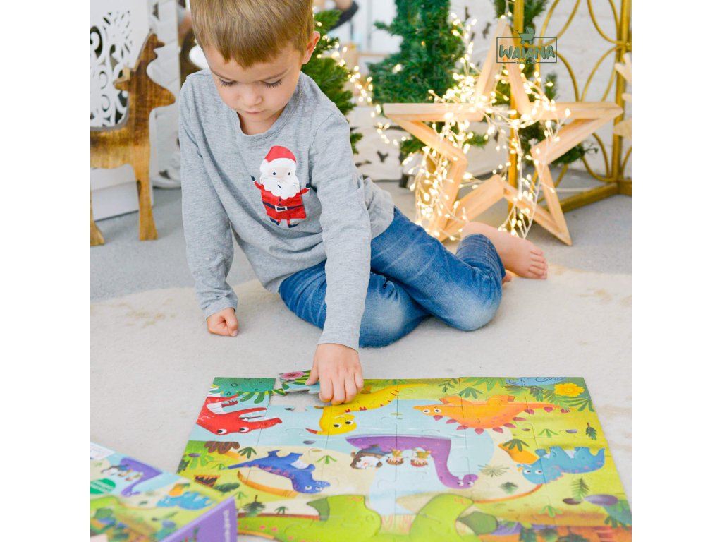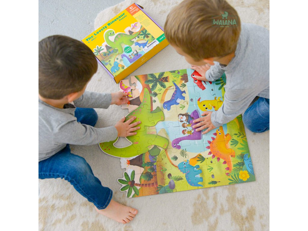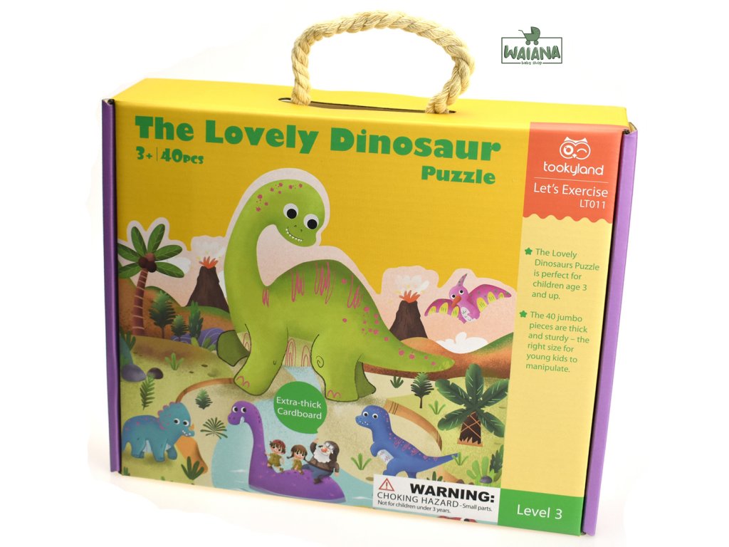 obsahuje 40 tvarovaných kúskov puzzle dostatočne veľkých aby ich malé deti bez problémov udržali. Puzzle majú ilustráciu úžasného farebného dinosaurieho sveta s mnohými dinosaurími druhmi.Tieto puzzle sú vyrobené z vysokokvalitného papiera a dobre do seba zapadajú.Puzzle k vám prídu v krásnom kartónovom kufríku s rukoväťou a majú ľahko čistiteľný povrch aby dlho vydržali ako nové.