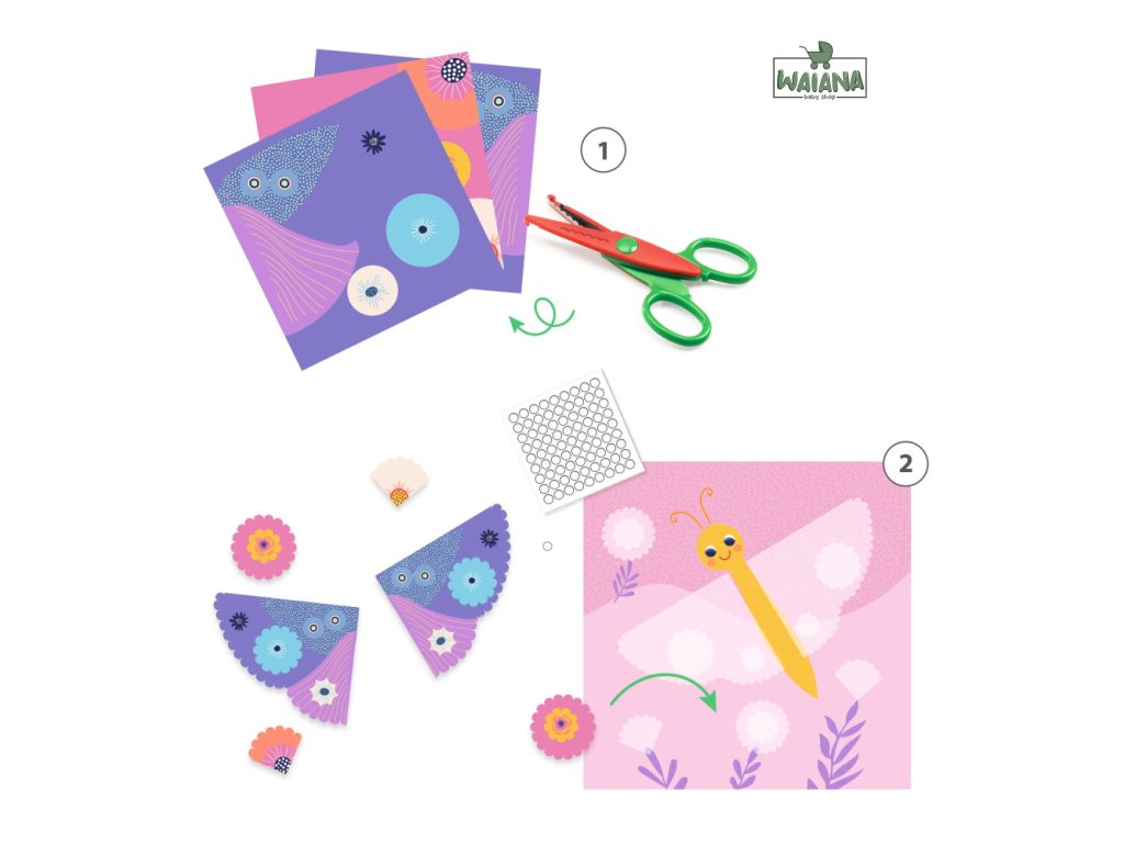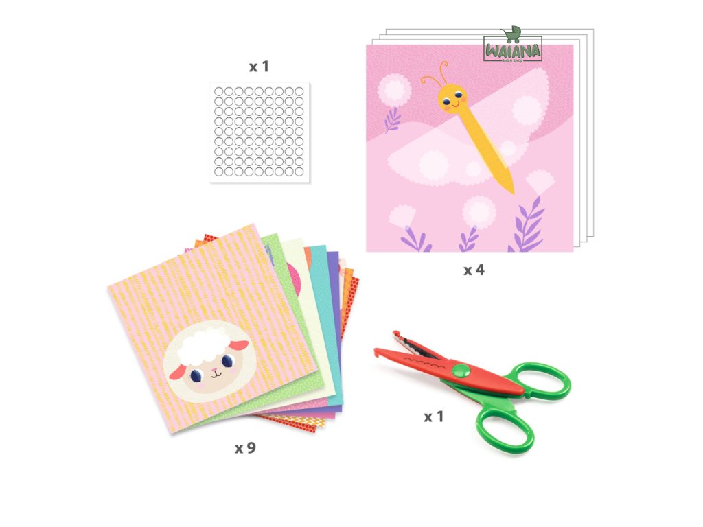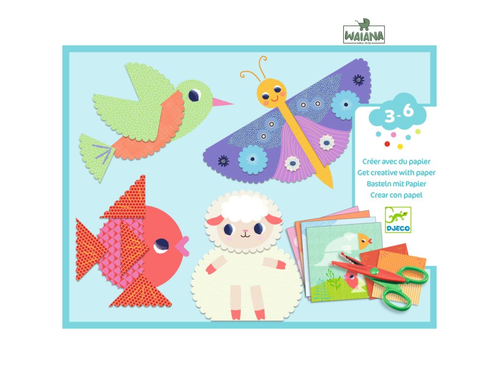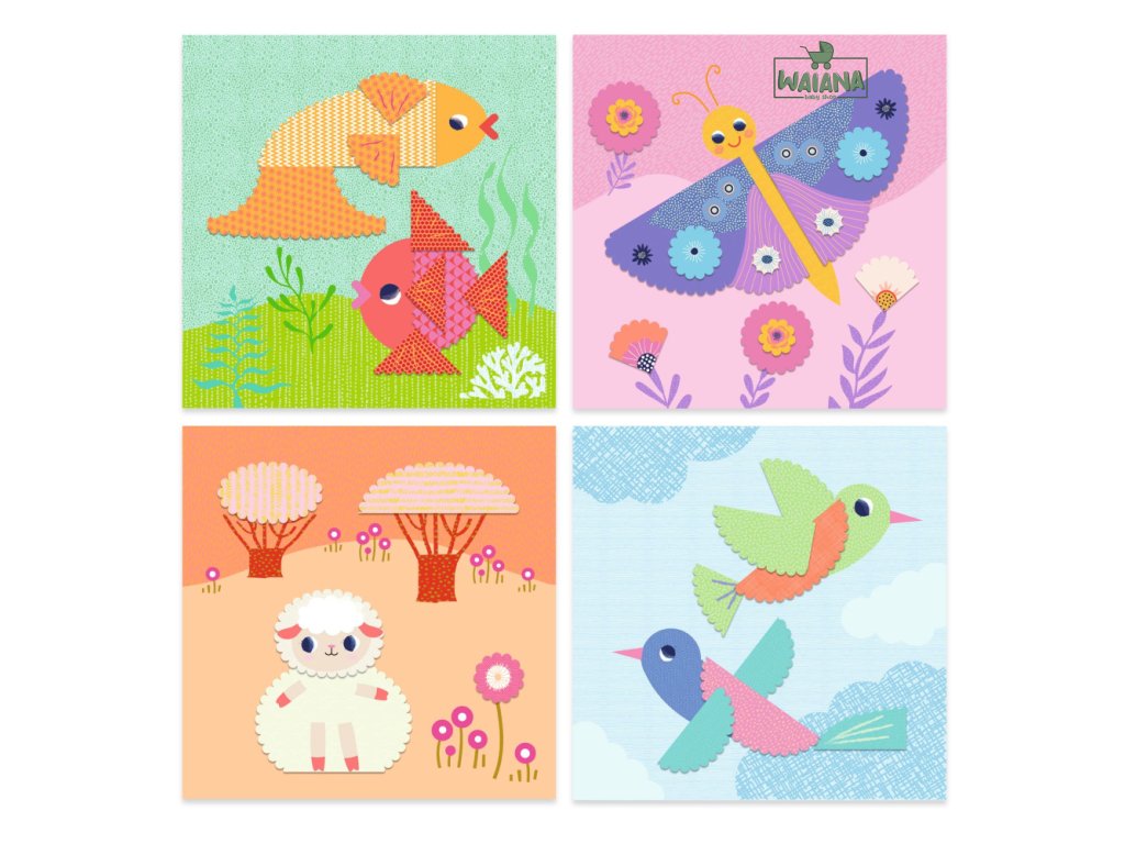 Tvorenie z papiera Zvieratká Kreatívna sada 4 obrázkov zvieratiek na dotvorenie ozdobnými papierovými tvarmi. Dieťa vystrihne z farebných vzorovaných papierových hárkov tvary, ktorými doplní ilustrácie na obrázkoch. Papiere prilepí obojstranne lepiacimi krúžkami, vďaka čomu nezostanú na papieri žiadne stopy po lepidle. Nožnice sú dekoračné a obojstranné, na oblúčiky smerujúce von alebo dnu. Výsledkom budú koláže v jemných farbách s oblúčikovým vzorom.Obsah: 4 obrázky na dotvorenie, 9 papierových hárkov na strihanie, 1 dekoračné nožnice na strihanie vlniek, 1 hárok obojstranne lepiacich krúžkov, obrázkový návodRozmery obrázkov: 21 x 21 cm