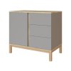 Prevedenie: Dvierka a zásuvky. Na ľavej strane 1 dvierka, vo vnútri 1 polica, na pravej strane komody sú 3 zásuvky.