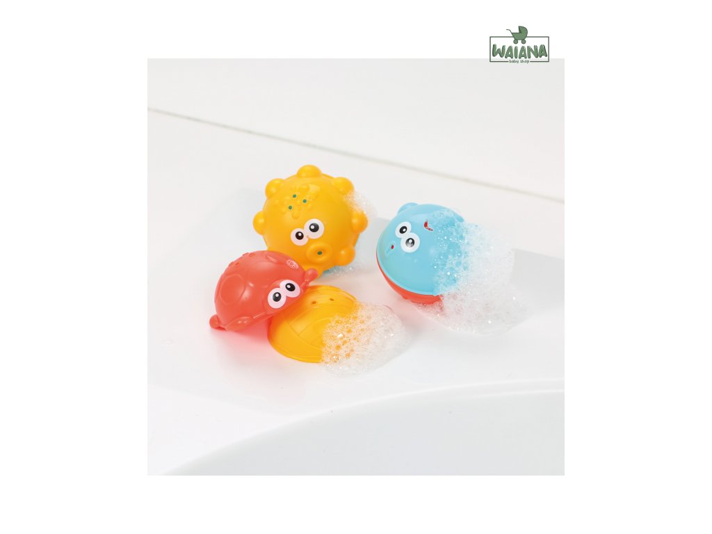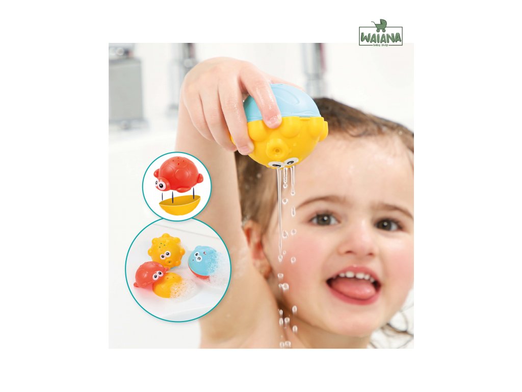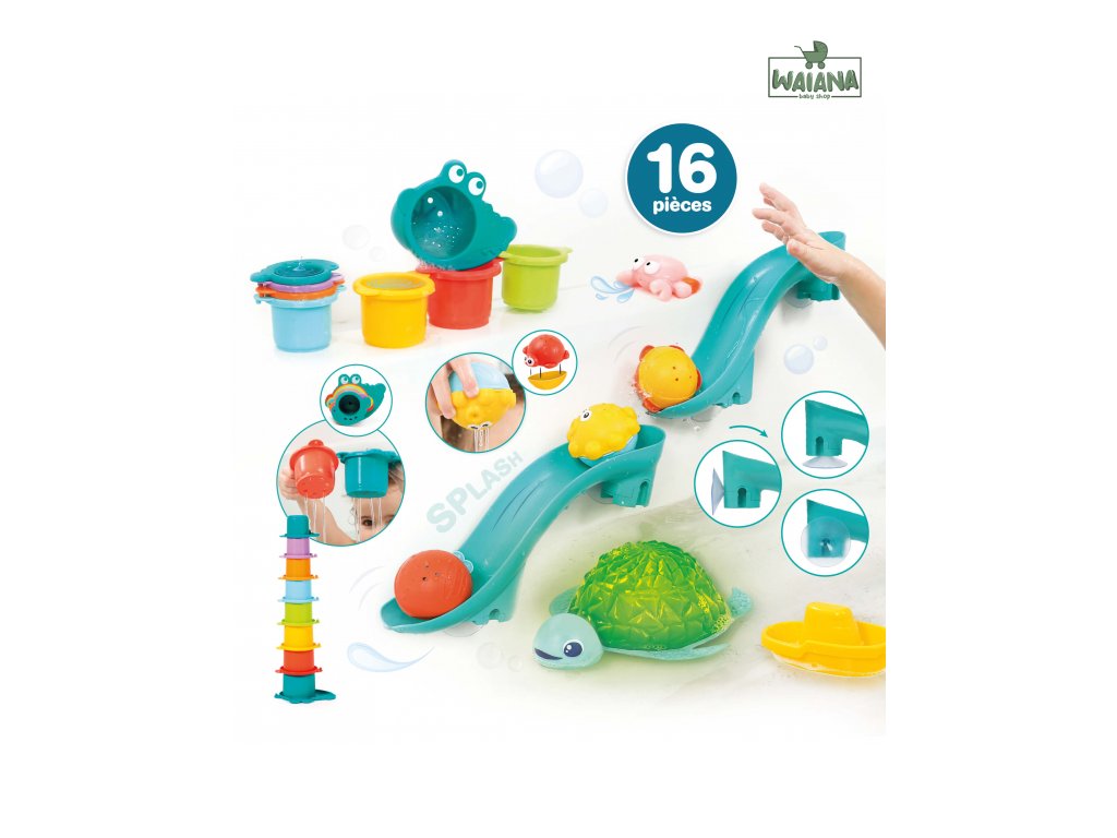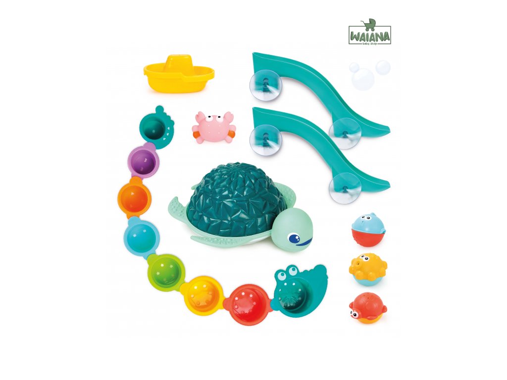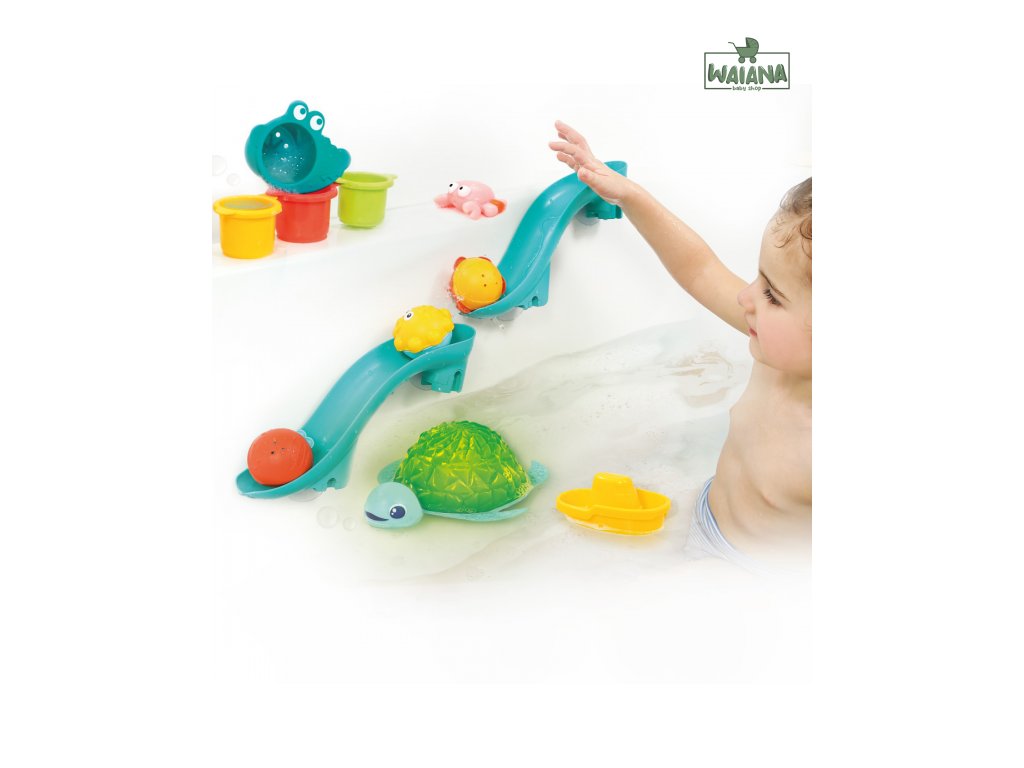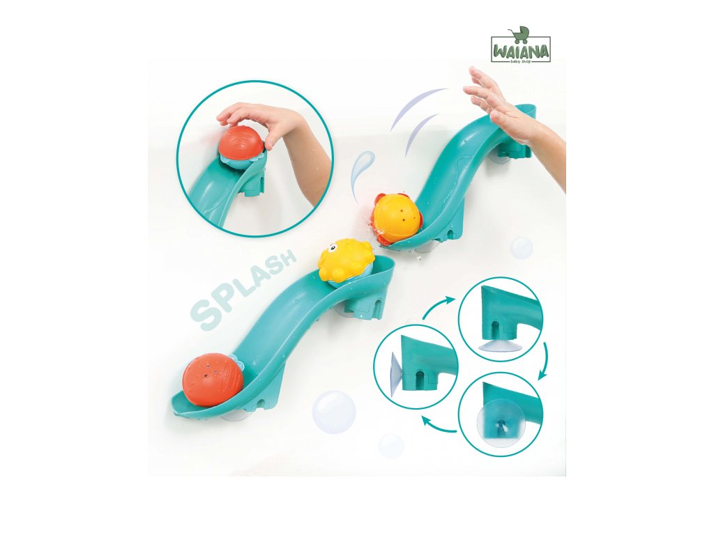 - Vodní skluzavky a míčky - dvě odnímatelné skluzavky s přísavkami můžete upevnit na vanu nebo obklady – vytvoříte tak jedinečnou vodní dráhu pro tři míčky