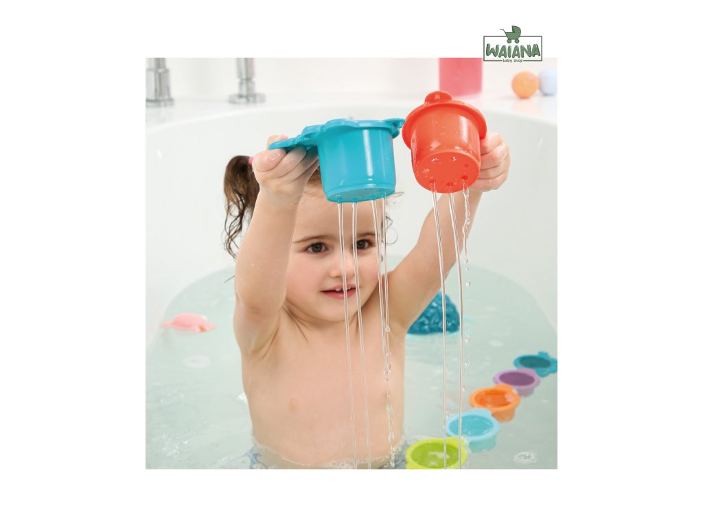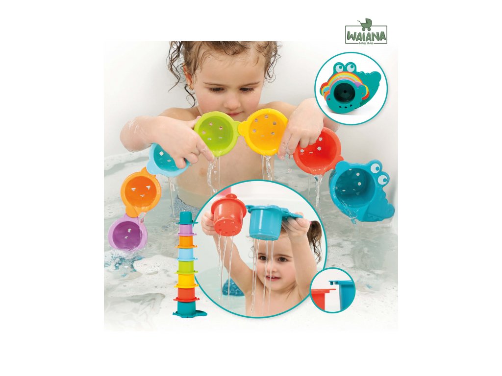 - Zábavu doplňuje stříkací krab, lodička a krokodýl se sadou 8 stohovatelných kelímků, ideálních pro vodní experimenty a efekty deště