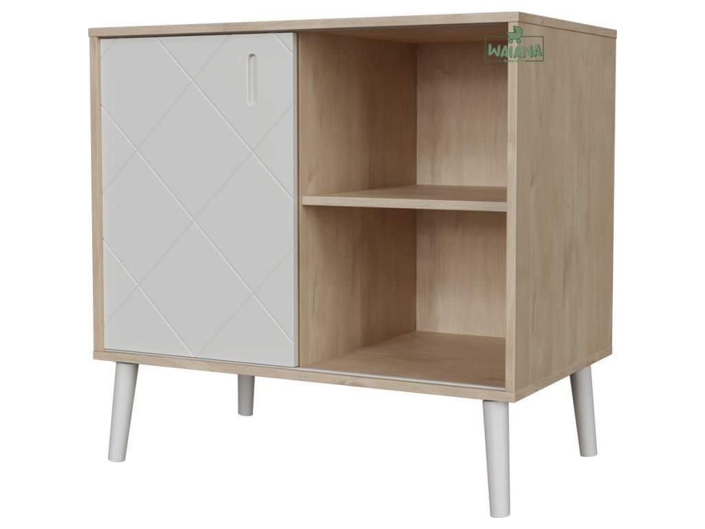 Ponúka úložný priestor a pritom nezaberá zbytočne priestor. Jej výška, úložné plochy a variabilita boli navrhnuté na základe potrieb rodičov. Predná časť výrobku je vyrobená z lakovanej MDF s hodvábnym leskom, zatiaľ čo zvyšok nábytku je vyrobený z laminovanej drevotriesky. Slúži nielen ako úložný priestor, ale hornú časť komody je možné po namontovaní nástavca na komodu, využiť ako prebaľovací pult.