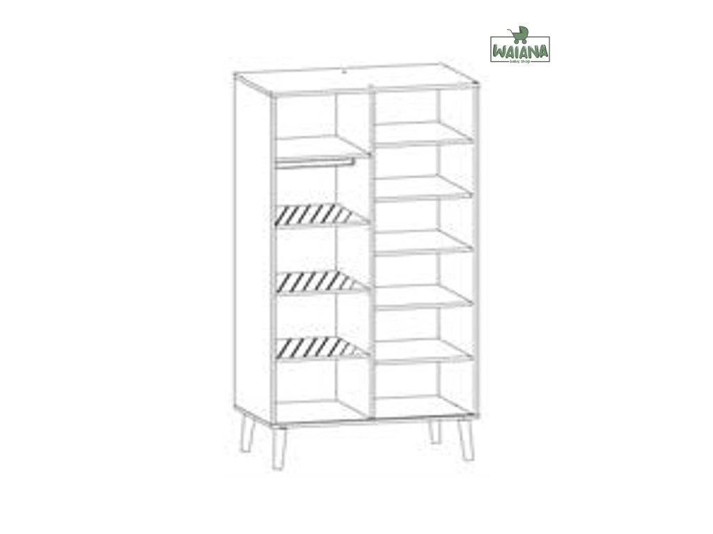 Prevedenie: Skriňu je možné zostaviť v policovom alebo závesnom prevedení. Ľavá strana skrine obsahuje 1 policu a 2 šatníkové tyče, zatiaľ čo pravá strana skrine obsahuje 5 poličiek.