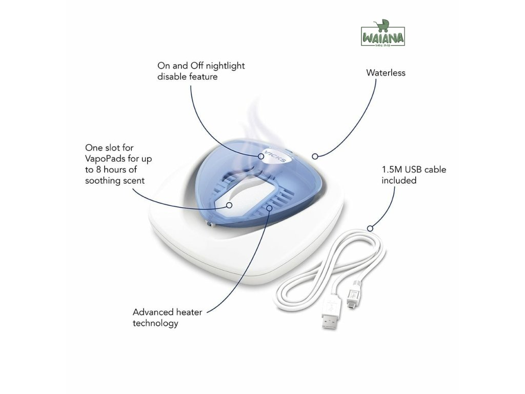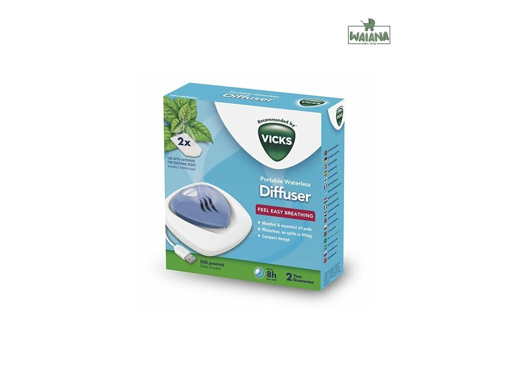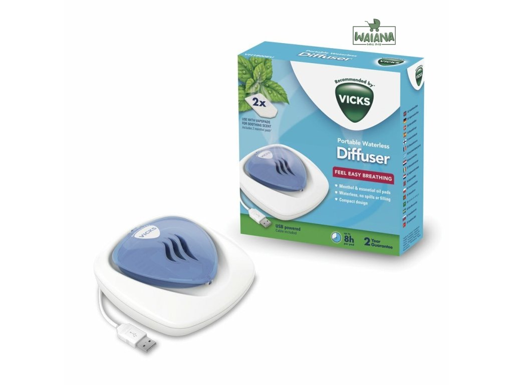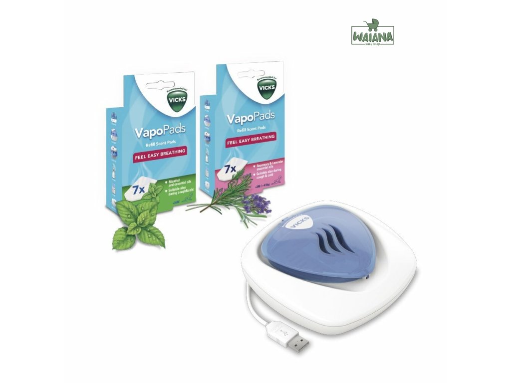 Komfort pri dýchaní.Bezvodý difuzér jemne zahrieva vône VapoPad nasiaknuté esenciálnymi olejmi, čím aktivuje a uvoľňuje upokojujúce výpary v miestnosti, zlepšuje komfort a kvalitu vdychovaného vzduchu a zaisťuje pocit ľahkého dýchania. Zariadenie napájané cez USB je ľahké a ideálne na cestovanie. Jeho tichá prevádzka s jemným nočným osvetlením zaisťuje plnú funkčnosť aj počas spánku.Výhody bezvodého difúzora.Prenosné USB zariadenie.Ľahký, ideálny na cesty.Všestranné využitie - ideálny do spálne alebo kancelárie.Uľahčuje dýchanie.Uľahčuje dýchanie počas noci vďaka upokojujúcej a aromatickej pare, ktorá tlmí príznaky prechladnutia.Jednoduché a rýchle použitie.Difúzer je pripravený na použitie po 5 minútach.Má jemné nočné podsvietenie s tlačidlom zapnutia / vypnutia.Ako vám vyhovuje.Množstvo esenciálnych olejov v každom vankúšiku bolo testované, takže viete, že používate správne množstvo pre vás a vašu rodinu. Každý vankúšik dokáže uvoľniť až 8 hodín upokojujúcich a aromatických výparov, čo vám umožní odpočívať cez noc.Kompaktná veľkosť.Kompaktný, ľahký a prenosný dizajn napájaný cez USB.Rýchla, pohodlná a bezpečná prevádzka.Funguje bez použitia vody, bez rizika rozliatia alebo potreby doplnenia. Mäkké nočné svetlo s funkciou zapnutia / vypnutia. Rýchla a jednoduchá aplikácia vonných náplní VapoPad.Kompatibilný s vonnými vankúšikmi VapoPad.Kompatibilný s voňavými VapoPadmi s esenciálnymi olejmi. Zásobník pojme 1 VapoPad na 8 hodín upokojujúcich vôní. Vône sú dostupné v 2 verziách, klasická vôňa - zmes esenciálnych olejov z mentolu, eukalyptu a cédra a jemná vôňa rozmarínu a levandule.