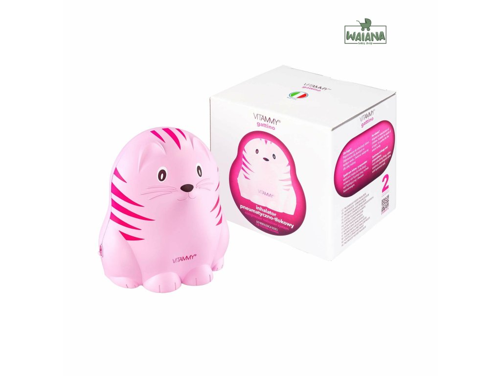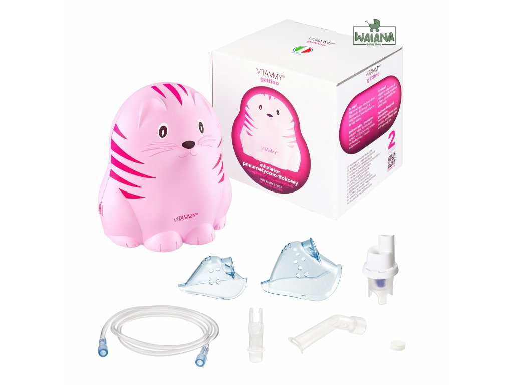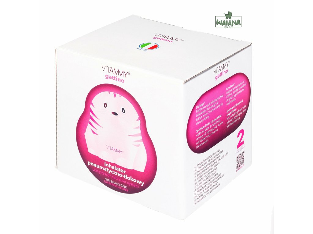 Priateľský k deťom.Predstavujeme vám priateľské mačiatko dostupné v dvoch farebných prevedeniach, modré a ružové. Jeho tvar a saténový povrch uľahčujú inhaláciu a vzbudzujú dôveru detí. Inhalátor Vitammy Gattino je zdravotnícka pomôcka, ktorá má parametre nebulizácie v súlade s normou PN-EN13544-1.Najdôležitejšie parametre.-atraktívny, pre deti pre priateľský tvar mačiatka-na výber dve farebné verzie, ružová a modrá-parametre nebulizácie v súlade s normou PN-EN13544-1-taliansky dizajn-biokompatibilita použitých materiálov, zaručene hypoalergénne a netoxické-saténový povrch-rukoväť na prenášanie-jednoduchá výmena filtra-náustok, maska ??detská veľkosť, maska ??veľkosť pre dospeléhoPre koho?Môže byť použitý u dojčiat, detí a dospelých.Nepostrádateľný pre pacientov pri liečbe zápalov horných a dolných dýchacích ciest.Indikácie pre nebulizáciu.1. Horné dýchacie cesty-alergická nádcha, -zápal podnebných mandlí, -chronická nádcha a faryngitída, -zápaly (nosa, hrdla, hrtana s hnisavým a hlienovým výtokom), -zápaly postranných nosových dutín, -chronická laryngitída, -vyčerpanie hlasiviek, -ústne mykózy, -faryngitída a laryngitída, -pooperačné stavy v oblasti nosa a prínosových dutín, -čistenie pľúc (podpora dýchacieho systému u fajčiarov, obyvateľov veľkých, znečistených miest, najmä malých detí, ľudí pravidelne trpiacich chorobami dýchacích ciest) -pri chronickej únave a v prevencii a liečbe kardiovaskulárnych ochorení.2. Dolné dýchacie cesty:-recidivujúca bronchitída -chronická bronchitída -bronchiálna astma -sino-bronchiálny syndróm -pneumocystóza -stavy po zápaloch pľúc -plesňové infekcie dýchacieho systému -emfyzém a pneumokonióza s príznakmi bronchitídyAko používať rozprašovač?Posaďte sa pohodlne vzpriamene.Ak používate masku - (veľkú alebo detskú), uistite sa, že tesne prilieha k tvári. V maske sú otvory, ktoré pri výdychu pustia von vzduch. Voľne dýchajte a na konci nádychu si urobte krátku pauzu.Ak používate náustok - mal by byť zľahka medzi zubami a pevne pritlačený k ústam. Dýchajte ústami.Ak používate nosovú kanylu - opatrne si ju vložte do nosových dierok. Netlačte si ju ďalej do nosa. Dýchajte nosom.Nebulizácia je dokončená, keď je liek prerušovane vypúšťaný z rozprašovača (bublanie v nádobke alebo striekanie).Po dokončení nebulizácie príslušenstvo dôkladne umyte a dezinfikujte.Výhody nebulizácie.-Rozprašovače a liečivá pôsobia presne v mieste nádychu a v malej miere sa absorbujú do krvi. Liečivo podávané vo forme hmly vo vysokej koncentrácii sa dostáva priamo do pľúc a tak je možné použiť najnižšiu účinnú dávku.-Možnosť prispôsobenia individuálnej dávky a druhu lieku každému pacientovi.-Nebulizácia aplikovaná včas môže pacientovi umožniť vyhnúť sa potrebe užívania antibiotík, skrátiť trvanie ochorenia a výrazne zmierniť jeho príznakyObsah balenia.-náustok,-štandardná veľkosť masky,-maska v detskej veľkosti,-nádoba na lieky - veko,-nádoba na lieky - spodná časť,-nádoba na lieky - prívod vzduchu,-atomizér,-vzduchová hadička,-náhradný vzduchový filter.