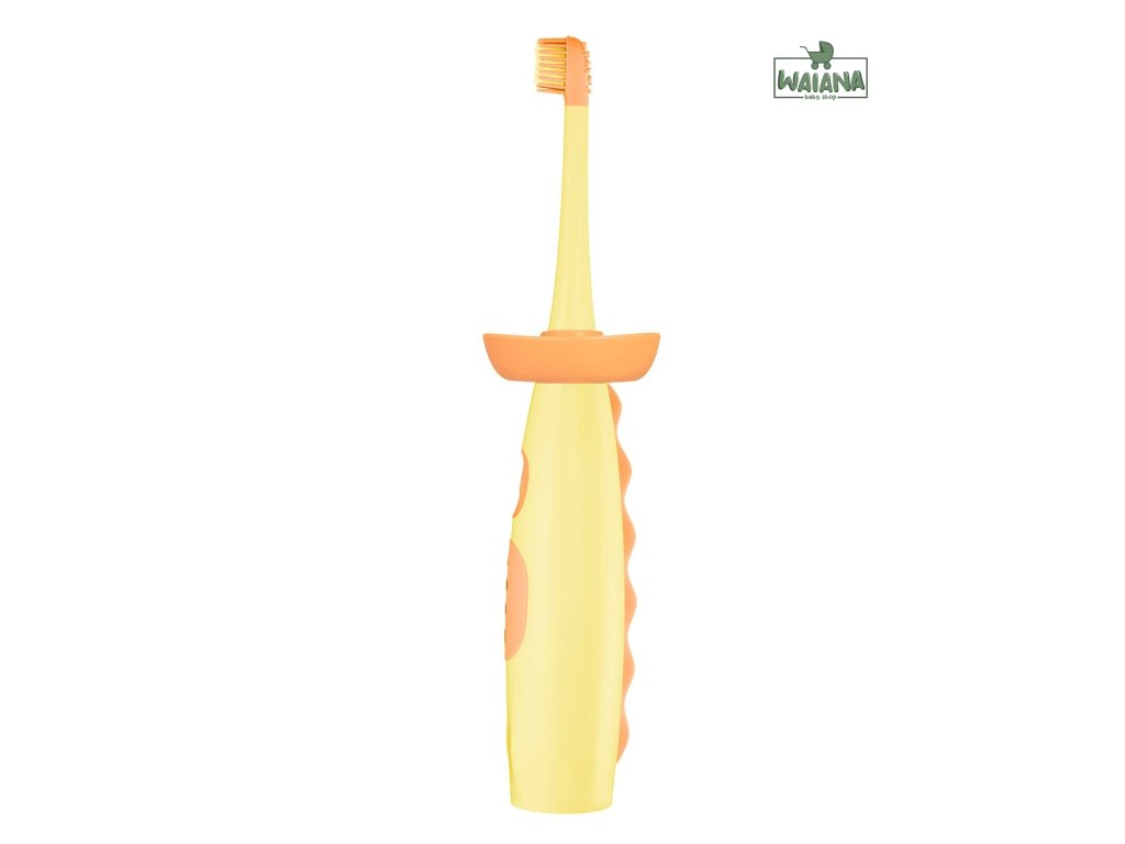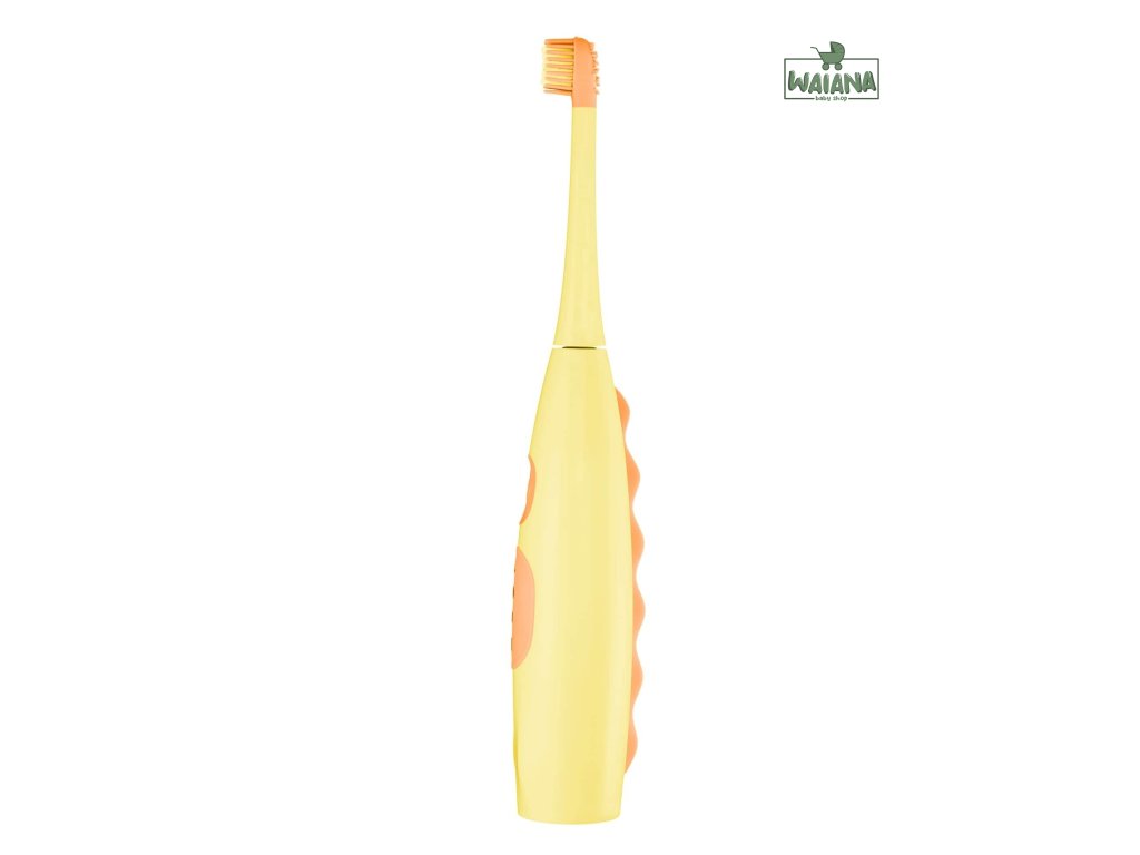 -Časovač s režimom 4 x 30 s a automatickým vypnutím po 2 minútach.-Indikátor slabej batérie.-Výkonná lítium-iónová batéria nabíjaná cez USB kábel.-Dlhá doba prevádzky na jedno nabitie (cca 15 dní).-Tichý a jemný prevádzkový režim.-Ergonomické puzdro so silikónovou zadnou stranou.-Vďaka silikónovej zadnej časti bezpečne padne do ruky. Vodotesná.-Atraktívny dizajn a farby.-Zubná kefka vyzerá ako dinosaurus.-Vyrobená z bezpečných certifikovaných materiálov (certifikované pre styk s potravinami).-Obsah balenia: 1 kefka, 1 hlava kefky, USB kábel, silikónový golier, návod na použitie.