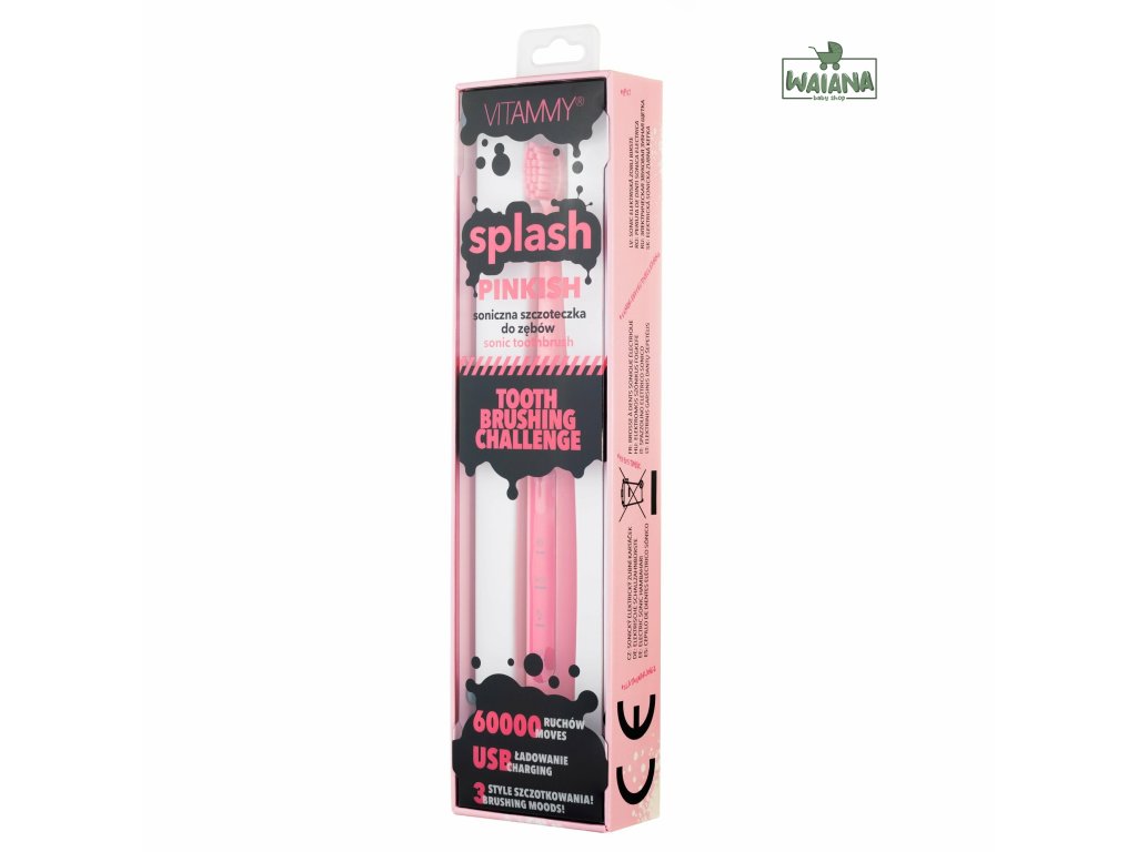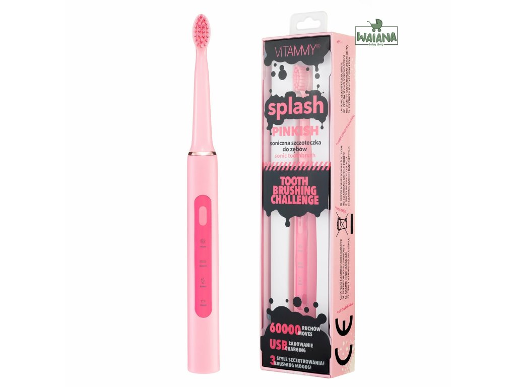 Prispôsobte štýl čistenia sebe a svojej nálade. Vybetre si jeden z troch programov a postarajte sa o svoje zdravie.SPLASH - denná dávka sviežosti.Výboj energie, ktorý odstraňuje zubný povlak a všetky nečistoty. Vaše zuby budú belšie, keď sa pustíte do výzvy sonického čistenia. Dokonalý štýl na ráno. SMOOTH – užite si jemnosť. Jemné vibrácie, ktoré čistia a upokojujú. BUBBLE - šumivý masážny efekt. Čistí zuby a masíruje ďasná. VITAMMY Splash 60 000 pohybov za minútu. -odstraňuje bakteriálny povlak -pomáha pri bielení zubov -zabraňuje vzniku zubného kazu -osviežuje dych Na jedno nabitie funguje 15 dní! Na nabíjanie kefky používate nabíjačku, takže sa staráte o životné prostredie a nekupujete škodlivé batérie. Vyberte si z 5 krásnych farieb.-YELLO -MINTY -SURF-PURPLY-PINK Zmena režimu jedným dotykom! Aktiváciou kefky môžete jedným tlačidlom zmeniť režim jej činnosti. VITAMMY Splash si zapamätá posledný režim umývania a ten sa spustí pri ďalšom čistení zubov. Zariadenie sa každých 30 sekúnd nakrátko zastaví, čo znamená, že je čas presunúť sa do inej oblasti úst. Tvarovaná hlava uľahčuje prístup k zadným zubom, zaručuje efektívnejšie čistenie ťažko dostupných miest a medzizubných medzier. Sada obsahuje. -1 rukoväť - kefka v jednej z vybraných farieb; -1 hlava kefky VITAMMY Splash; -1 USB napájací kábel -návod na použitie; Záruka na kefku je 2-ročná.