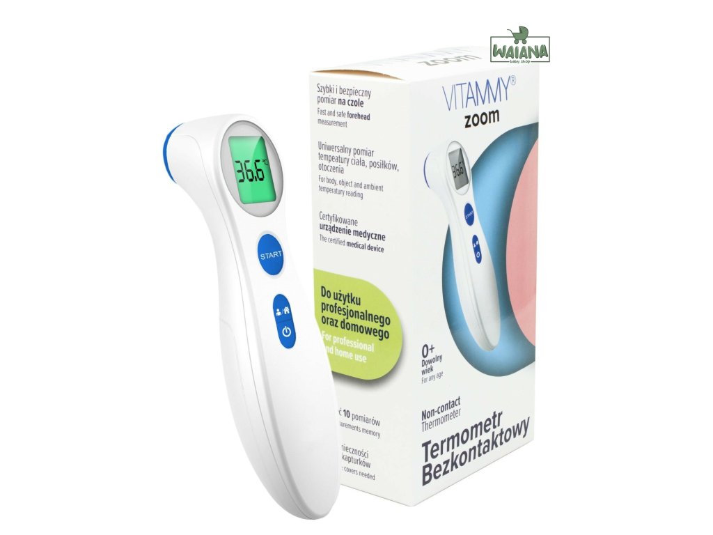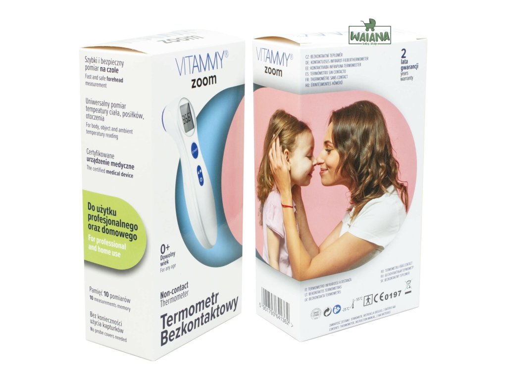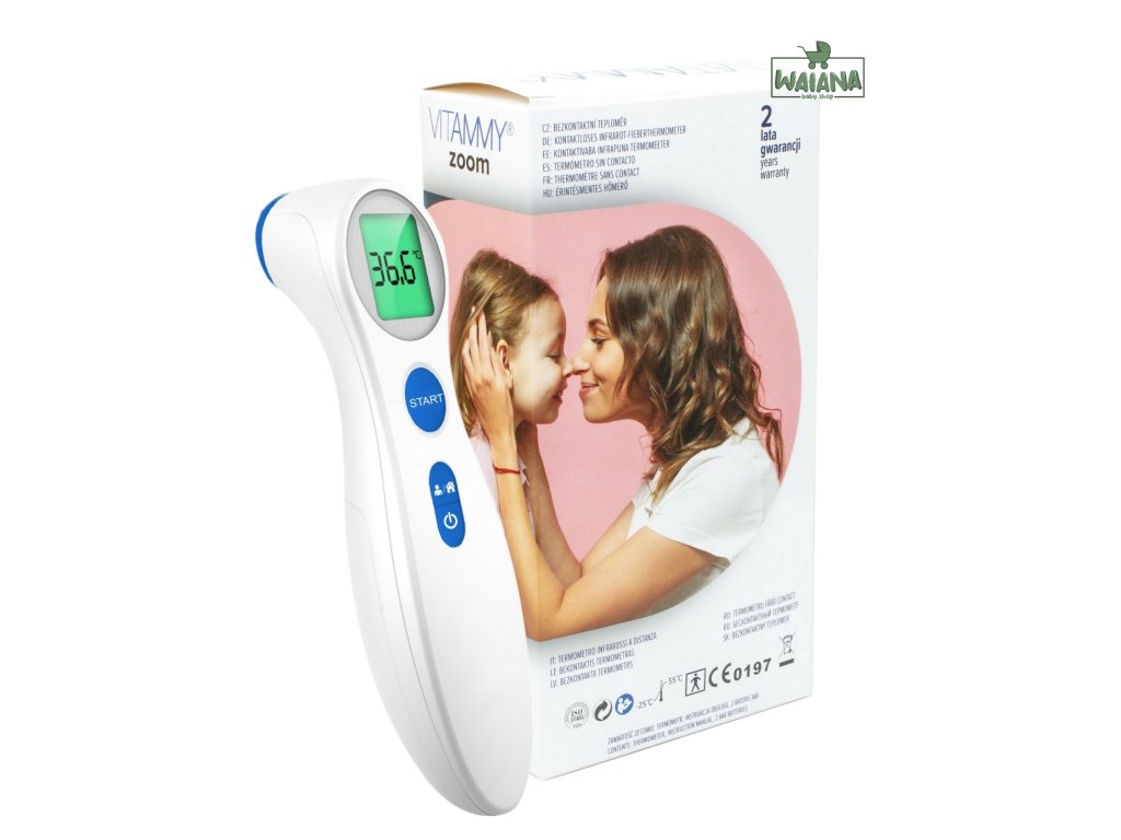 VITAMMY ZOOM bol špeciálne určený pre bezpečné a presné meranie teploty na čele. Funguje na princípe detekcie intenzity infračerveného žiarenia vyžarovaného z čela a následne prevádza namerané teplo na digitálnu hodnotu zobrazenú na prehľadnom LCD displeji. Okrem telesnej teploty je možné s teplomerom merať aj teplotu povrchov, ako je napríklad teplota detskej výživy alebo vody na kúpanie.