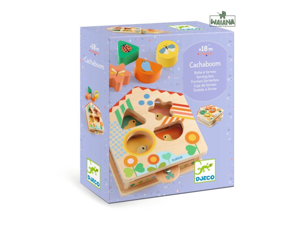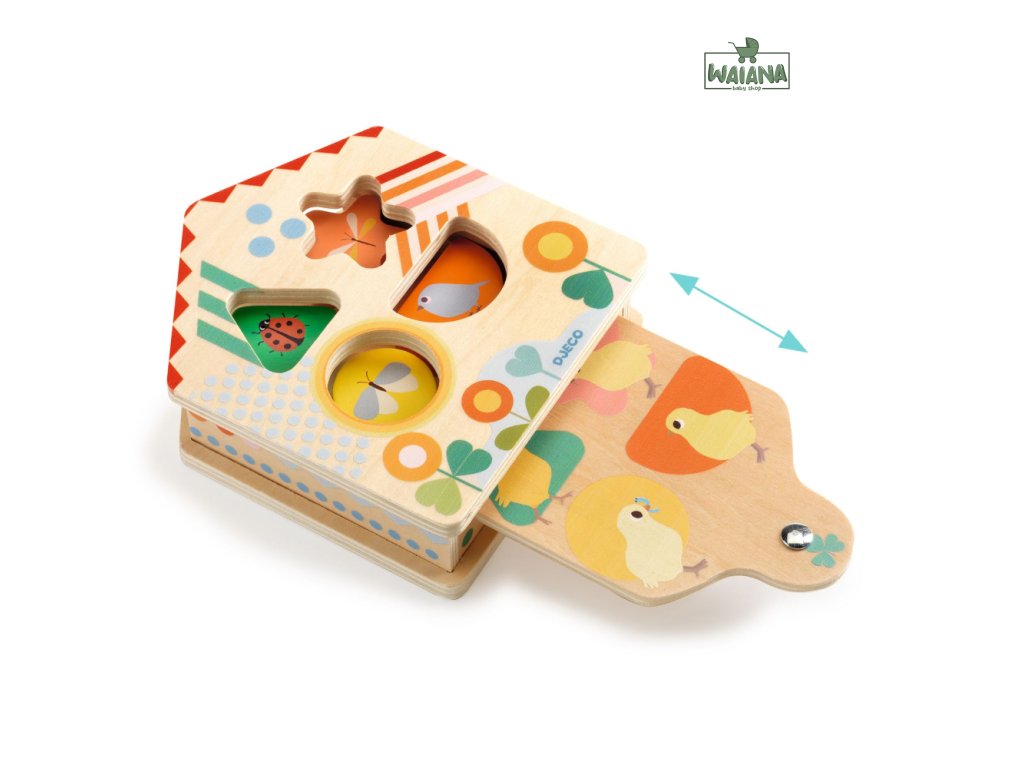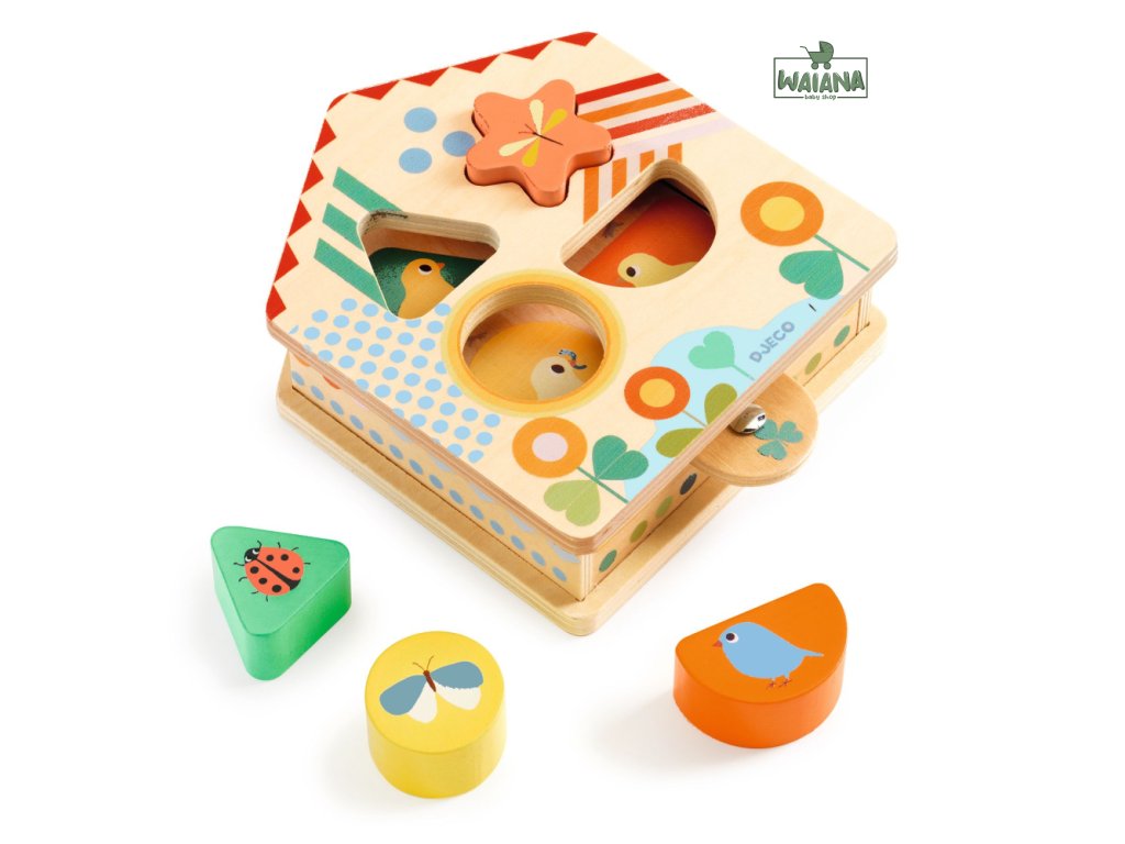 Vkladačka Zvieratá Drevený triediaci box v tvare domu Tento drevený triediaci box v tvare domu je ideálny pre deti od 18 mesiacov. Dieťatka zabaví vkladanie štyroch geometrických kúskov do zodpovedajúcich otvorov. Tento zábavný a vzdelávací produkt podporuje rozvoj jemnej motoriky a koordinácie očí a rúk. Keď dieťa zatiahne za uško, uvidí, ako všetky kúsky zmiznú naraz. Stačí opäť zatlačiť na uško a kúsky sa znova objavia mimo krabice, čo umožňuje opakovanú hru a nekonečnú zábavu.Z certifikovaného dreva pre bezpečnú hru Táto robustná vkladačka je vyrobená z kvalitného dreva s certifikátom FSC®, čo zaručuje bezpečnosť a ekologickú zodpovednosť. Kúsky sú navrhnuté tak, aby ich malé detské rúčky ľahko uchopili. Obsah balenia• jeden triediaci box • 4 geometrické tvary