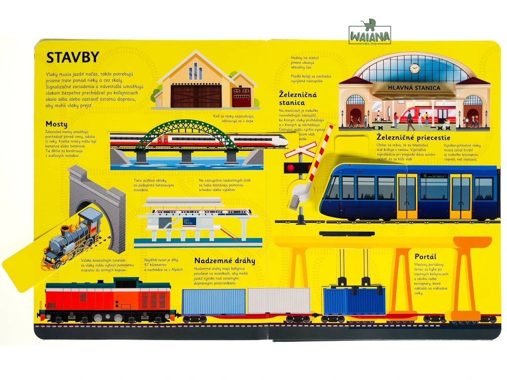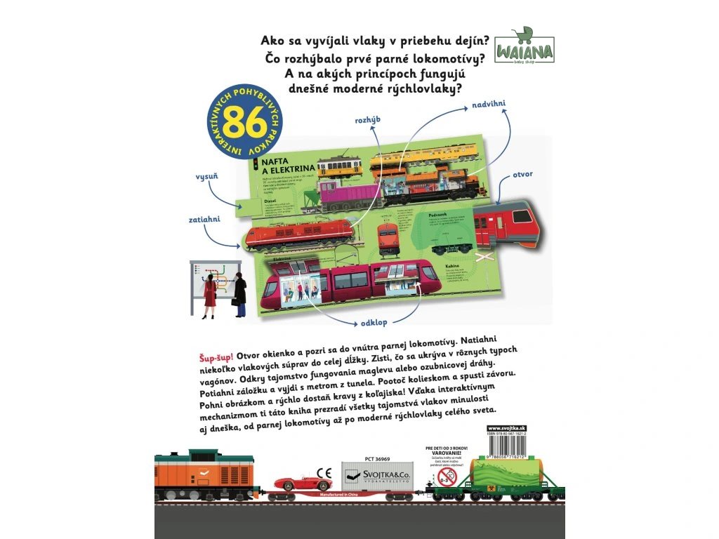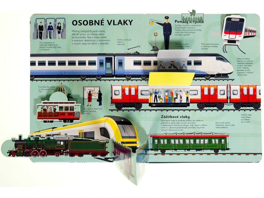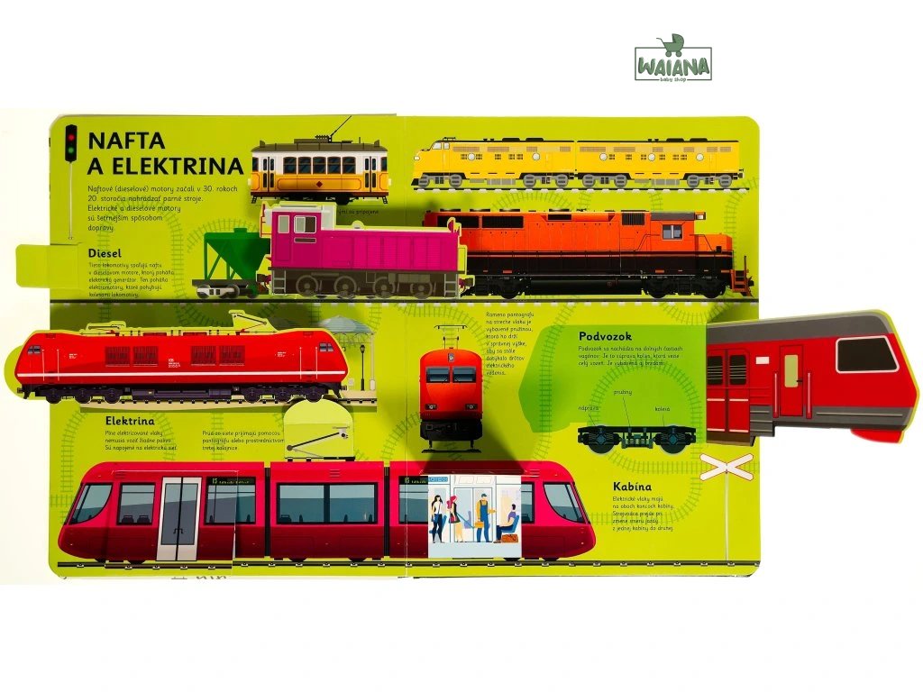 Vlaky v pohybeSvet vlakov v interaktívnej knihe s pohyblivými prvkami a rozkladacími súpravami. Preskúmaj fascinujúci svet vlakov vďaka tejto interaktívnej knihe plnej pohyblivých prvkov a okienok! Objav, ako fungovali parné lokomotívy alebo na akom princípe dnes jazdia moderné magnetické rýchlovlaky. Zisti, ako vlaky prekonávajú hory a rieky, ako vyzerá podzemné metro alebo čo všetko prepravujú nákladné súpravy. História aj súčasnosť vlakovej dopravy pre malých nadšencov.V knihe nájdeš 86 pohyblivých mechanizmov, vďaka ktorým môžeš vlaky posúvať, rozkladať alebo nahliadať dovnútra vagónov. Vydaj sa na cestu históriou aj súčasnosťou železníc - od dôb parných strojov až po najmodernejšie vlaky sveta.