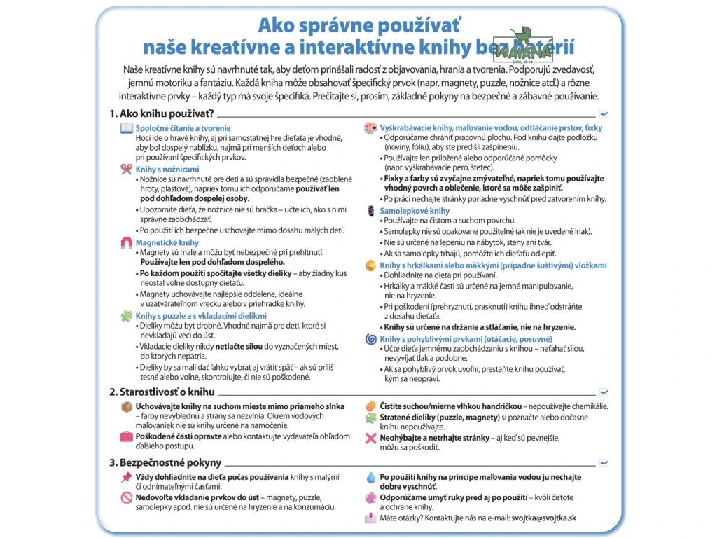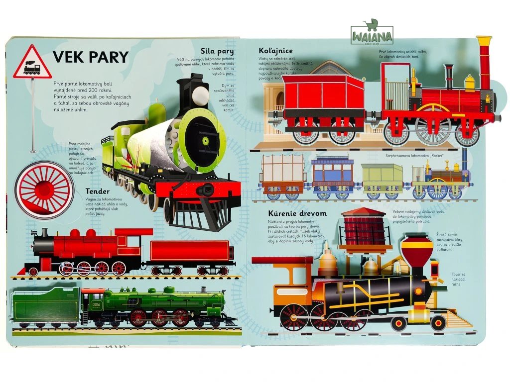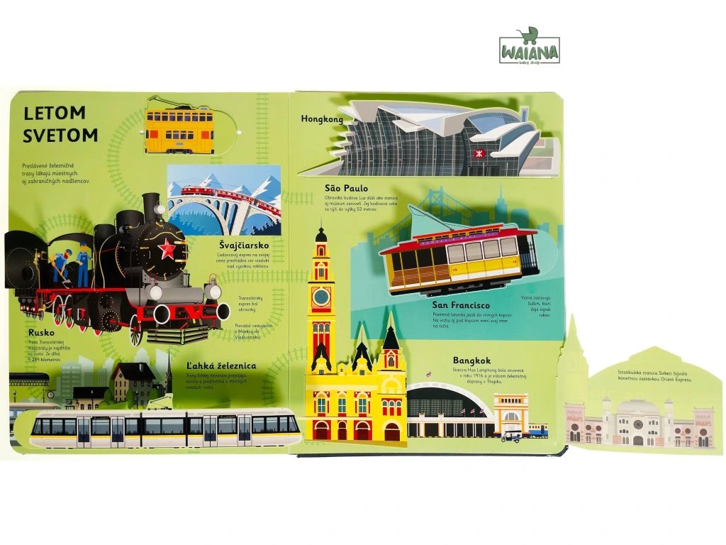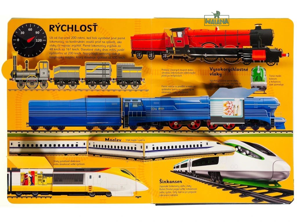 Vlaky v pohybeSvet vlakov v interaktívnej knihe s pohyblivými prvkami a rozkladacími súpravami. Preskúmaj fascinujúci svet vlakov vďaka tejto interaktívnej knihe plnej pohyblivých prvkov a okienok! Objav, ako fungovali parné lokomotívy alebo na akom princípe dnes jazdia moderné magnetické rýchlovlaky. Zisti, ako vlaky prekonávajú hory a rieky, ako vyzerá podzemné metro alebo čo všetko prepravujú nákladné súpravy. História aj súčasnosť vlakovej dopravy pre malých nadšencov.V knihe nájdeš 86 pohyblivých mechanizmov, vďaka ktorým môžeš vlaky posúvať, rozkladať alebo nahliadať dovnútra vagónov. Vydaj sa na cestu históriou aj súčasnosťou železníc - od dôb parných strojov až po najmodernejšie vlaky sveta.