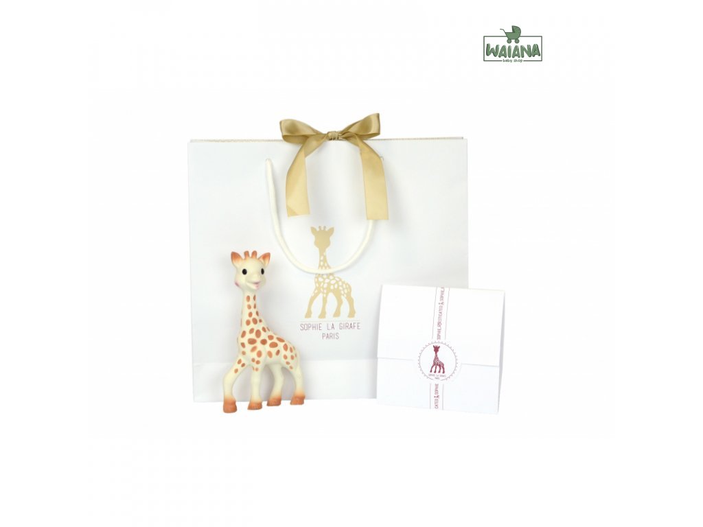 Krásne darčekové balenie obsahuje hračku žirafa Sophie a hryzátko zo 100% prírodného kaučuku. Súčasťou balenia je darčeková taška a kartička, kam môžete napísať venovanie alebo prianie.