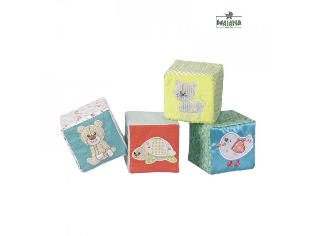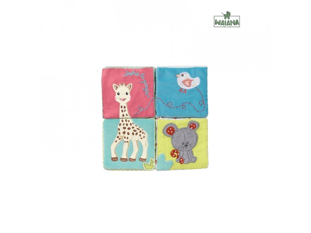 Textilné kocky s rôznymi aktivitami pomáhajú rozvíjať všetky detské zmysly. Mnoho aktivít: rôzne povrchy a materiály na rozvoj hmatu, každá kocka vydáva iný zvuk (šuští, hrká, píska atd.) a obrázky všetkých kamarátov žirafy Sophie, vďaka ktorým je možné kocky skladať ako puzzle. Rozmery: 8 x 8 cmVek: 3 mesiace+